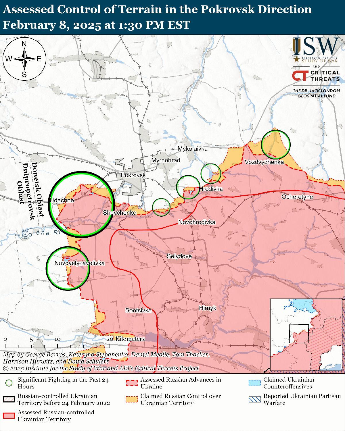 Оценка российского продвижения: 8 февраля Генеральный штаб Украины опубликовал карту, на которой указано, что российские войска продвинулись к северо-востоку от Новокалиново и в центре Барановки (оба к востоку от Покровска). [65]