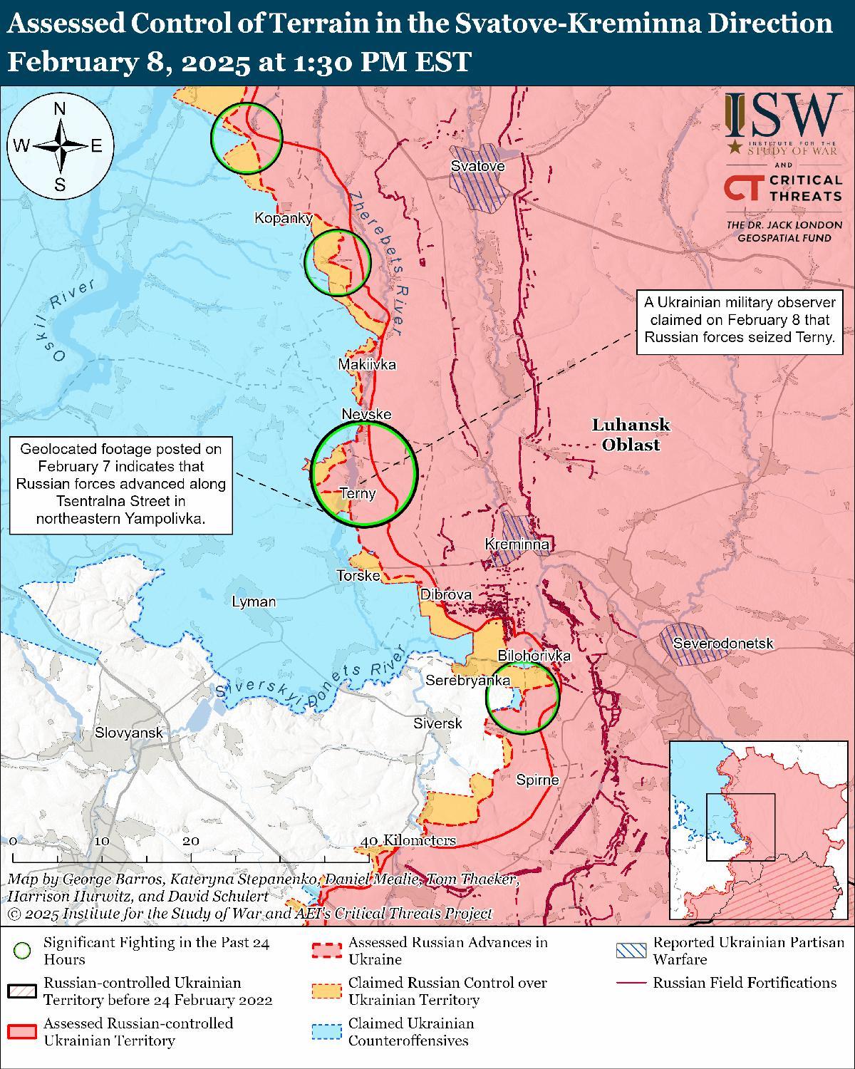 Оценка российского продвижения: геолоцированные кадры, опубликованные 7 февраля, свидетельствуют о том, что российские войска недавно продвинулись в северо-западной части Ямполовки (к северо-востоку от Лимана) и захватили поля к востоку от населенного пункта. [42] 8 февраля Машовец сообщил, что российские войска недавно захватили Терны (к северо-востоку от Лимана). [43]
