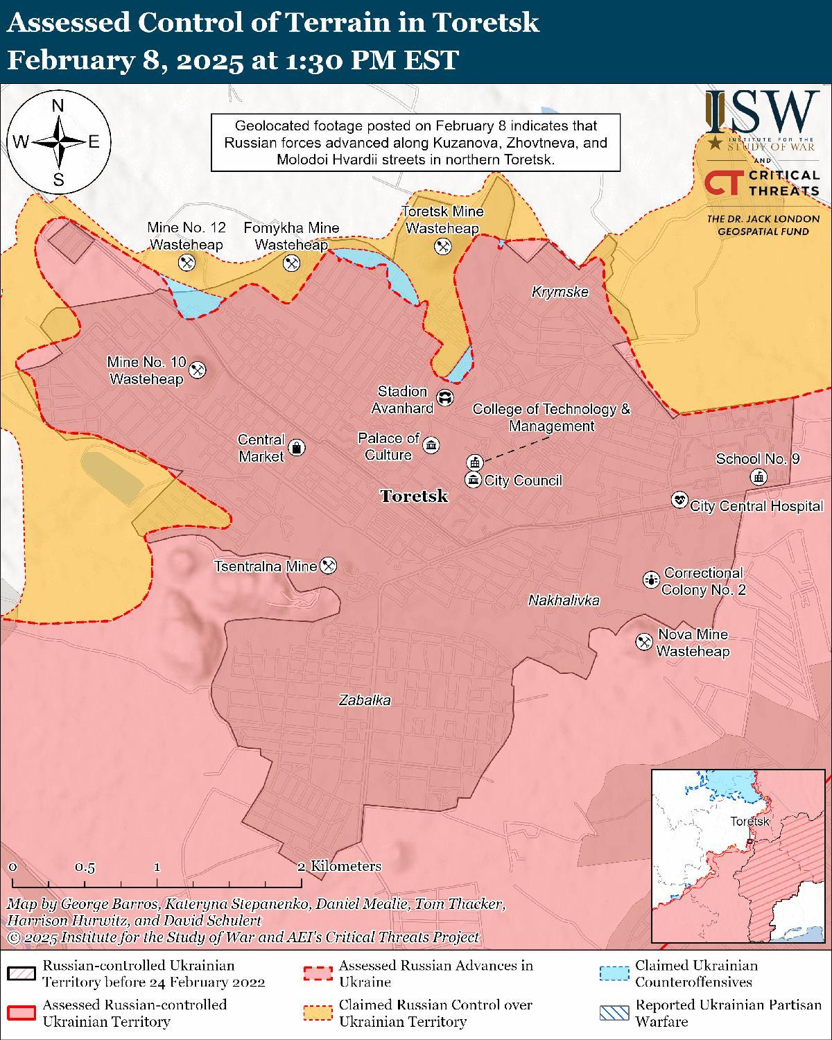 Российские оценки продвижения: геолоцированные кадры, опубликованные 8 февраля, указывают на то, что российские войска в последнее время продвинулись вдоль улиц Кузанвы, Молодого Гвардии и Жовтневой на севере Торецка. [54]