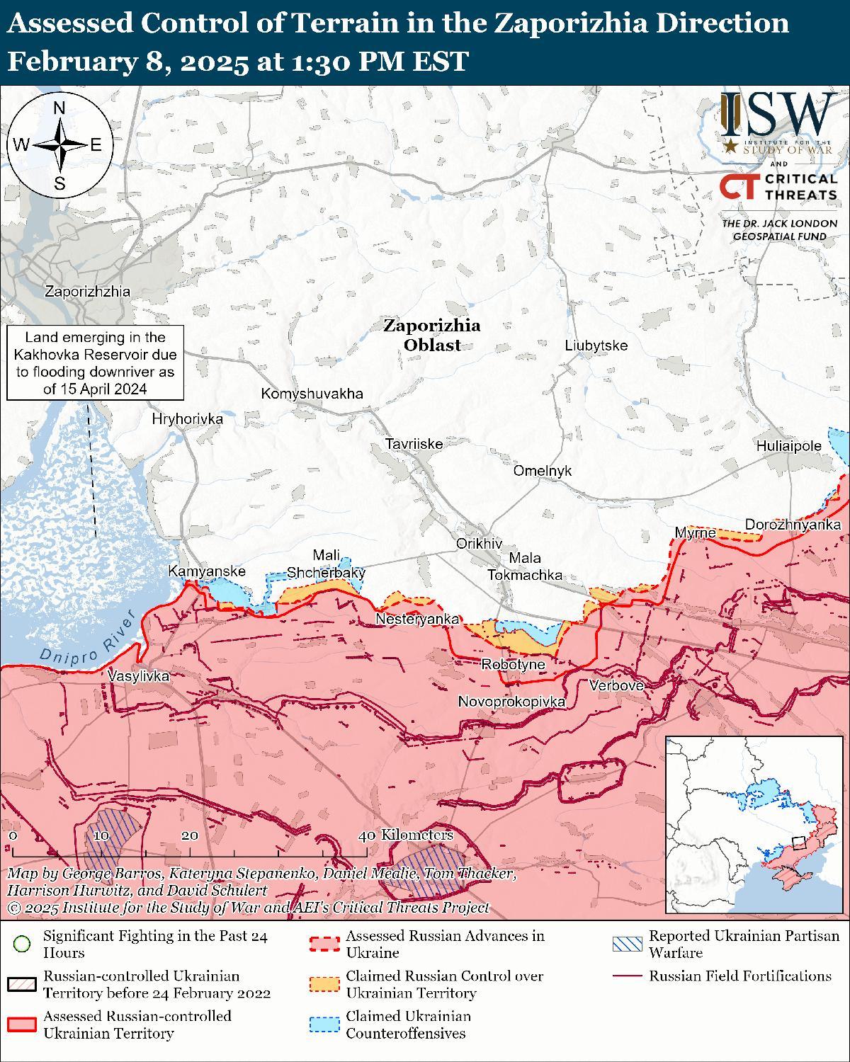 Оценка российского продвижения: геолоцированные кадры, опубликованные 8 февраля, указывают на то, что российские войска в последнее время незначительно продвинулись к западу и северо-востоку от Западного (к северу от Купянска). [32]