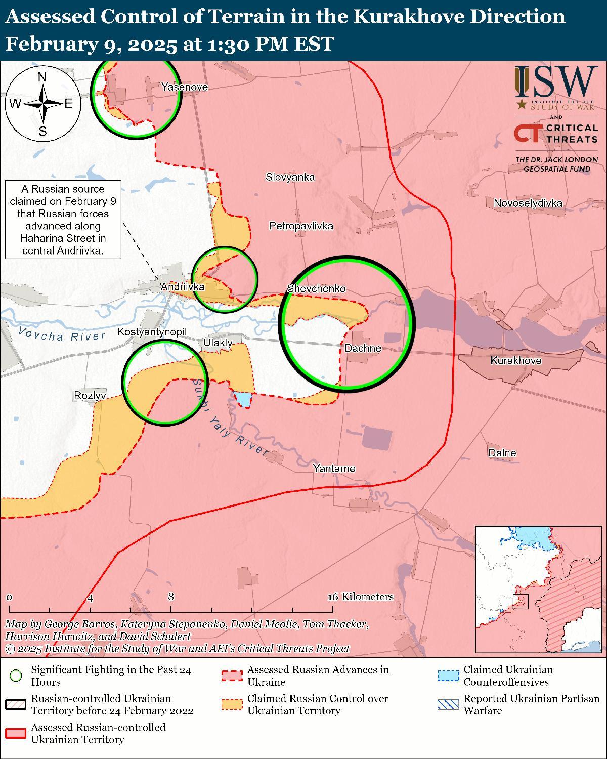Российские военные блогеры заявили 9 февраля, что российские войска продвинулись в направлении Улаклы (к западу от Курахово) и вдоль улицы Гагарина в центре Андреевки. [56] Однако ISW не обнаружил подтверждения этих заявлений.