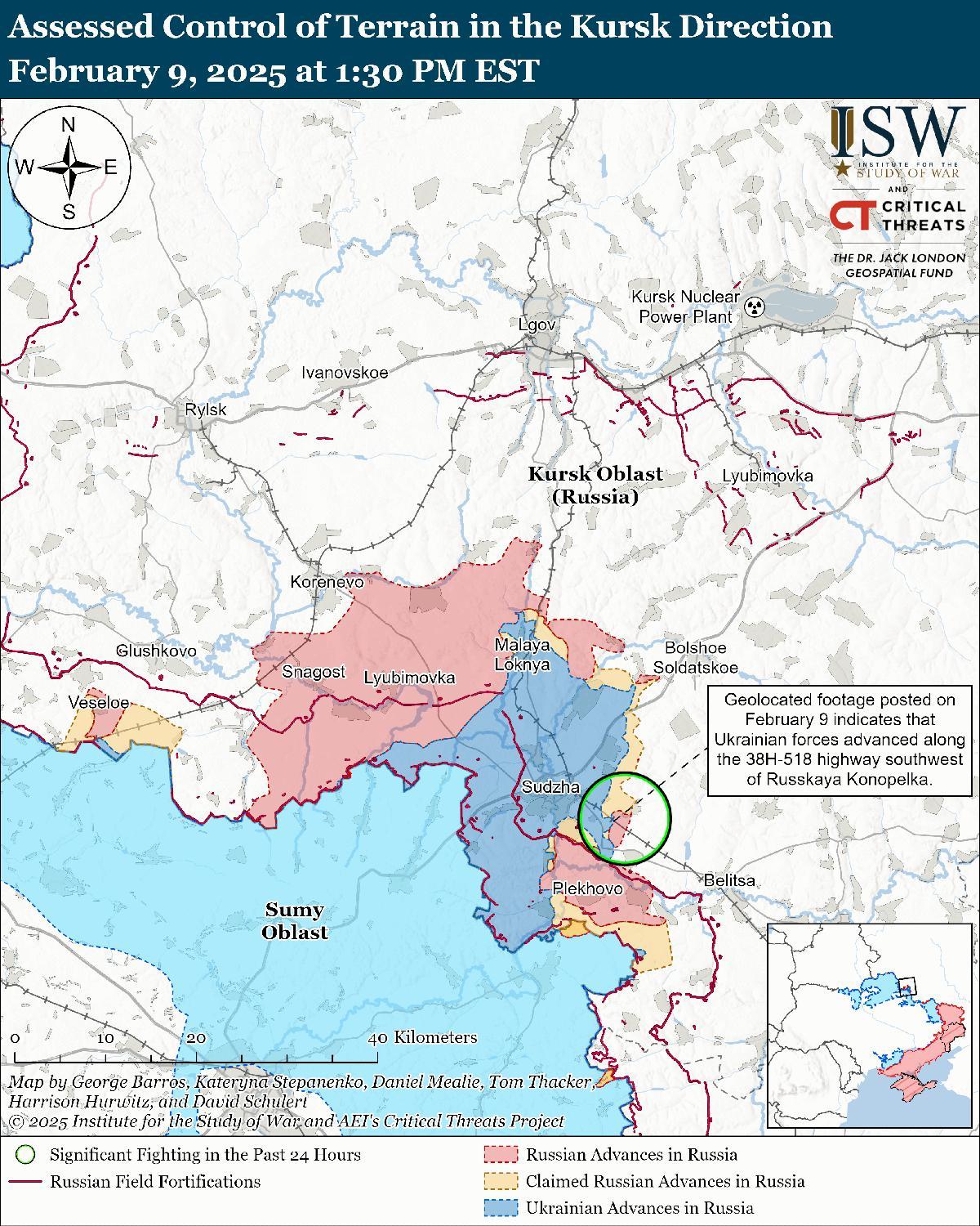 Оценка украинского продвижения: Геолоцированные кадры, опубликованные 9 февраля, указывают на то, что украинские войска недавно продвинулись вдоль трассы 38К-028 Суджа-Обоянь к юго-западу от Русской Конопелки. [13]