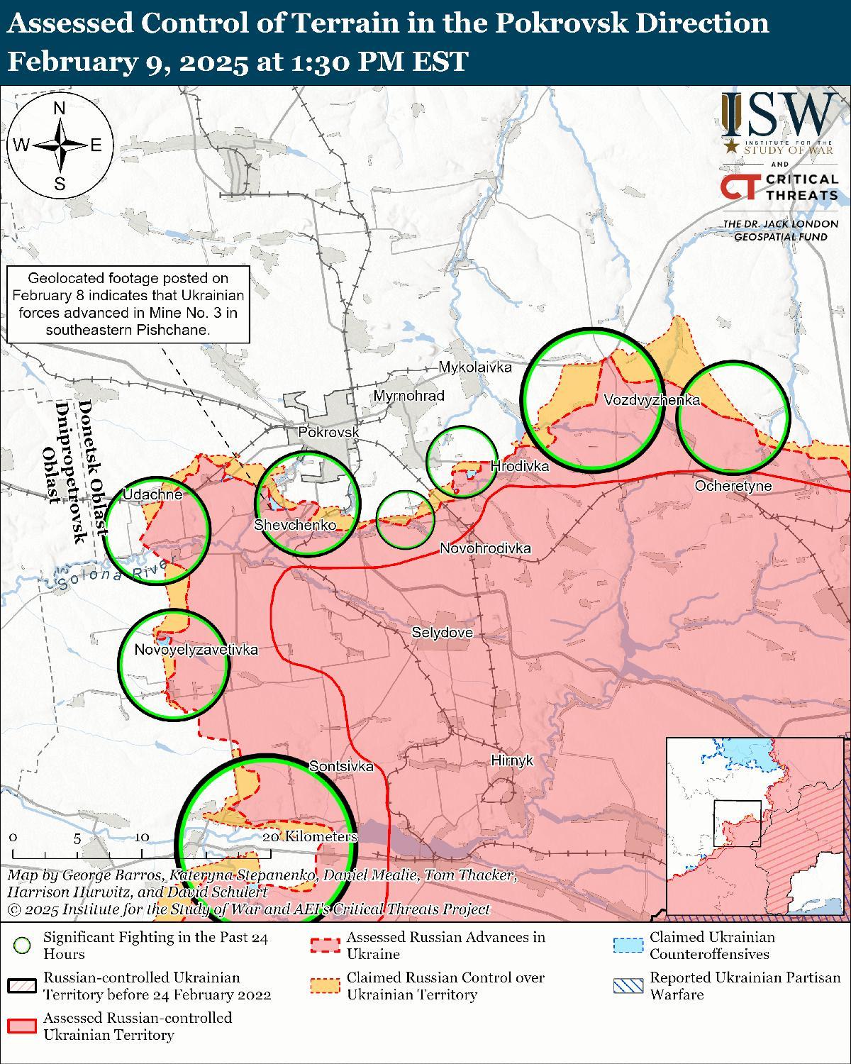 Оценка российского продвижения: Геолоцированные кадры, опубликованные 9 февраля, указывают на то, что российские войска недавно продвинулись к западу от Зверево. [47] 9 февраля Генеральный штаб Украины опубликовал карту, на которой указано, что российские войска в последнее время продвинулись к северу от Новоелизаветовки (к юго-западу от Покровска) и в юго-восточной части Малиновки (к востоку от Покровска). [48]