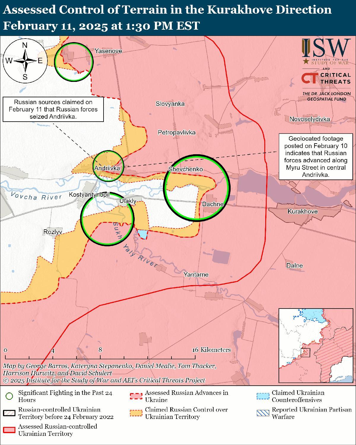 Оценка российского продвижения: Геолоцированные кадры, опубликованные 10 и 11 февраля, указывают на то, что российские войска продвинулись в центральной части Андреевки и вдоль трассы Т-0515 Покровск-Константинополь к западу от Словянки (к северо-западу от Курахово). [61]