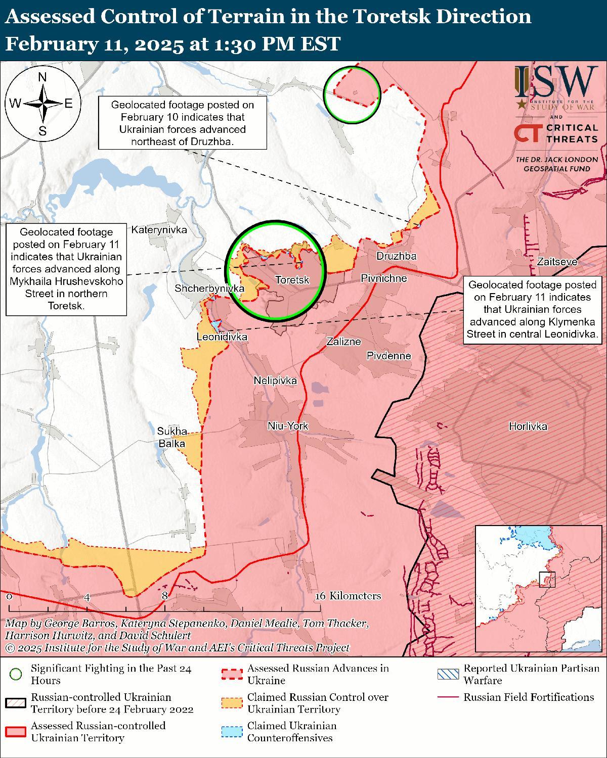 Оценка украинского продвижения: Геолоцированные кадры, опубликованные 10 и 11 февраля, указывают на то, что украинские войска недавно продвинулись к северо-востоку от Дружбы, на севере Торецка и в центральной части Леонидовки (к западу от Торецка). [45]