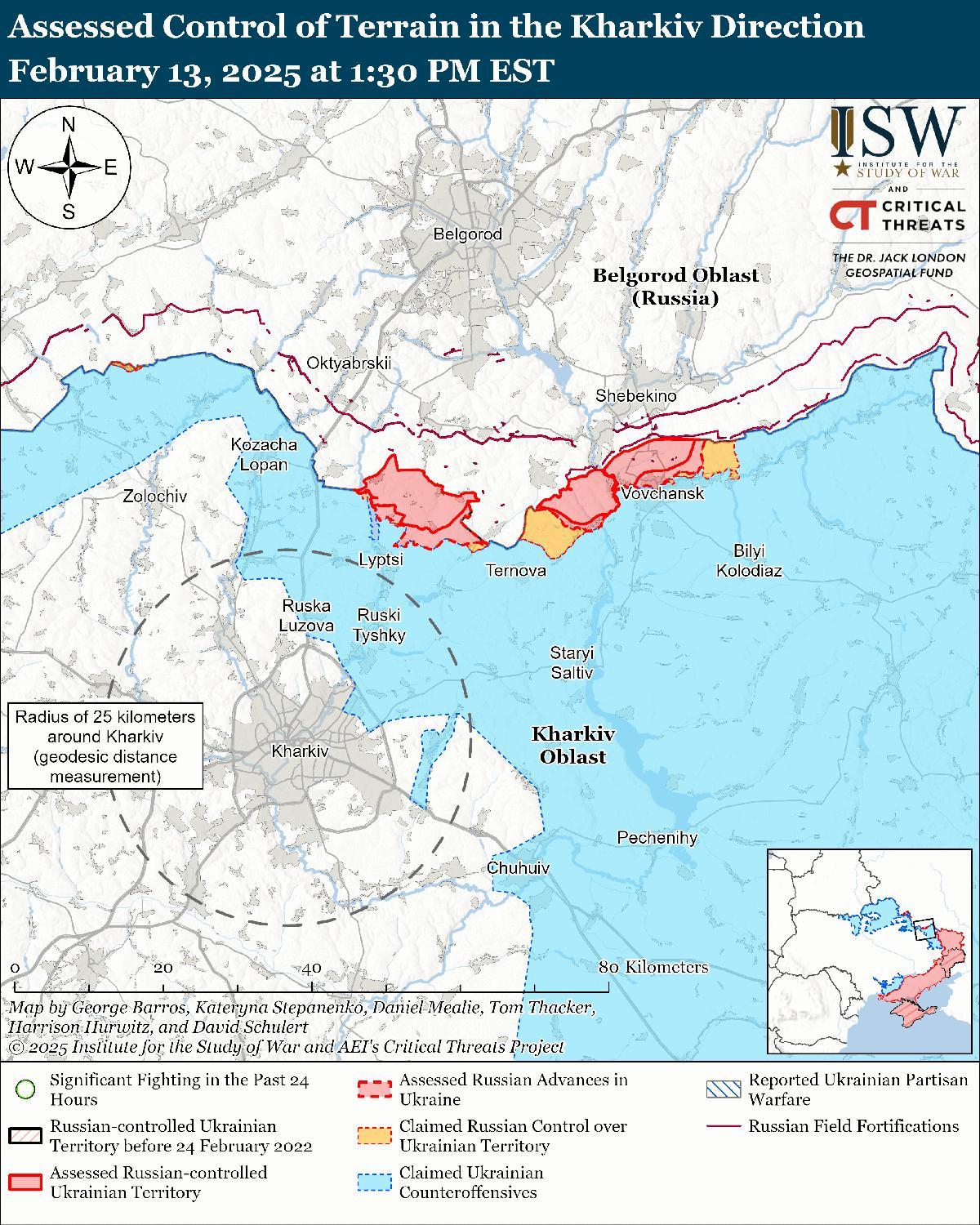 Бои на Украинском фронте в Курской области продолжались 13 февраля. Российские военные блогеры утверждают, что бои продолжаются к западу от Суджи в районе Свердликово и к юго-востоку от Суджи в районе Черкасской Конопелки. [29] 13 февраля российский военный блогер заявил, что украинские войска контратаковали в районе Куриловки (к югу от Суджи). [30]