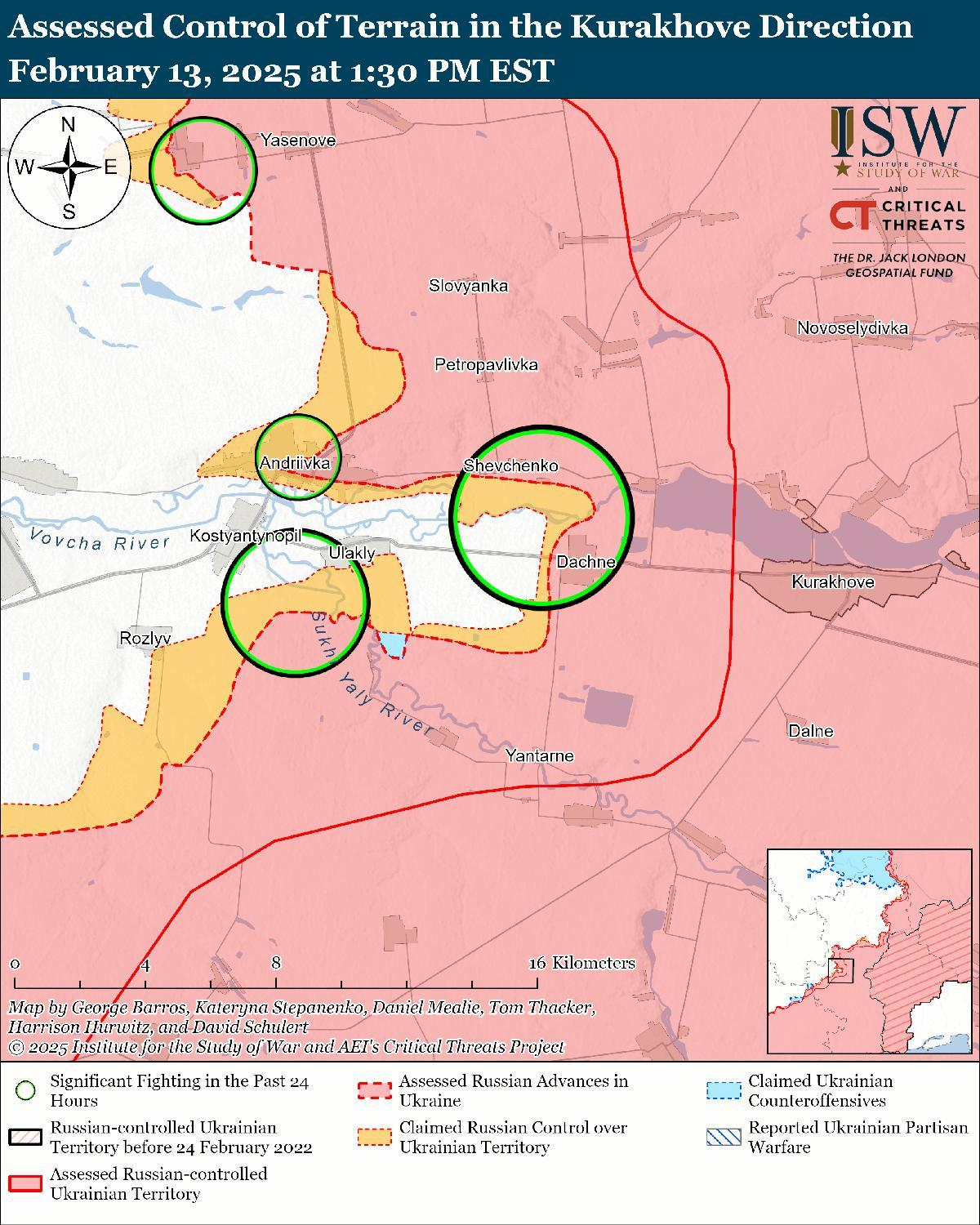 13 февраля враг продолжил наступательные действия на Кураховском направлении, но не продвинулся вперед. Враг атаковал северо-восточнее Курахово в районе Андреевки и Шевченко; к западу от Курахово в районе Дачного, Улаклы, Константинополя, Алексеевки, Розлива и Богатыря; и к юго-западу от Курахово в районе Зеленовки 12 и 13 февраля. [55]