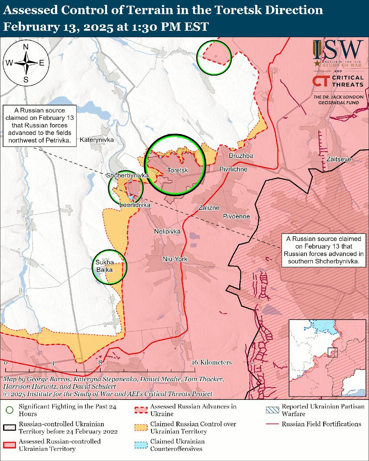 12 и 13 февраля враг продолжал наступательные действия в Торецке, к западу от Торецка в районе Щербиновки и к юго-западу от Торецка в районе Сухой Балки, но не продвинулся вперед. [45] Связанный с Кремлем российский военный блогер утверждал, что российские войска отразили небольшую украинскую механизированную атаку на окраинах Торецка. [46]