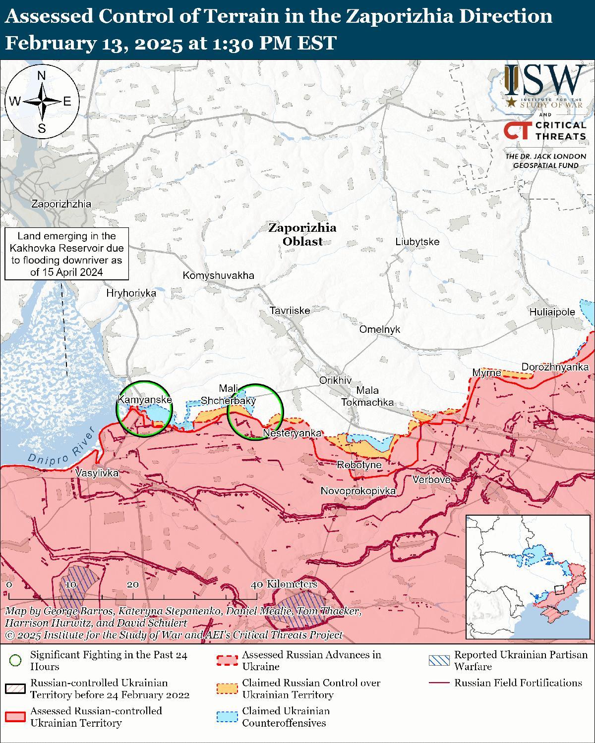 Ни российские, ни украинские источники не сообщали о наземных действиях на Днепровском направлении 13 февраля.