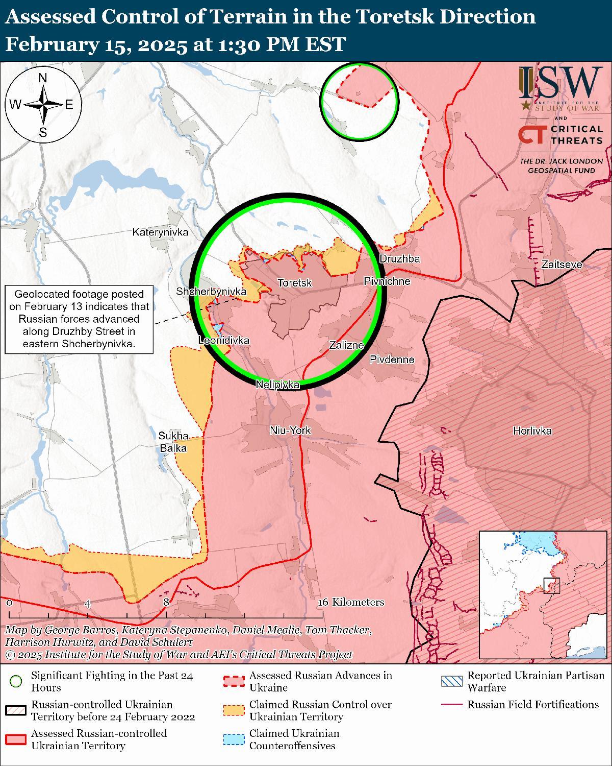 Оценка российского продвижения: Геолоцированные кадры, опубликованные 13 февраля, указывают на то, что российские войска недавно продвинулись в восточной части Щербиновки. [77]