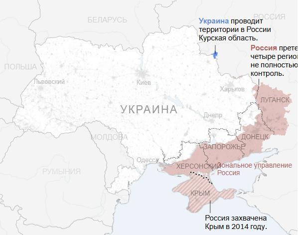 Украина заявила, что никогда не признает никаких изменений в своих границах. Россия претендует не только на примерно 20 процентов территории страны, которую она уже контролирует, но и на участок удерживаемой Украиной территории в четырех регионах, которые она не полностью контролирует.
