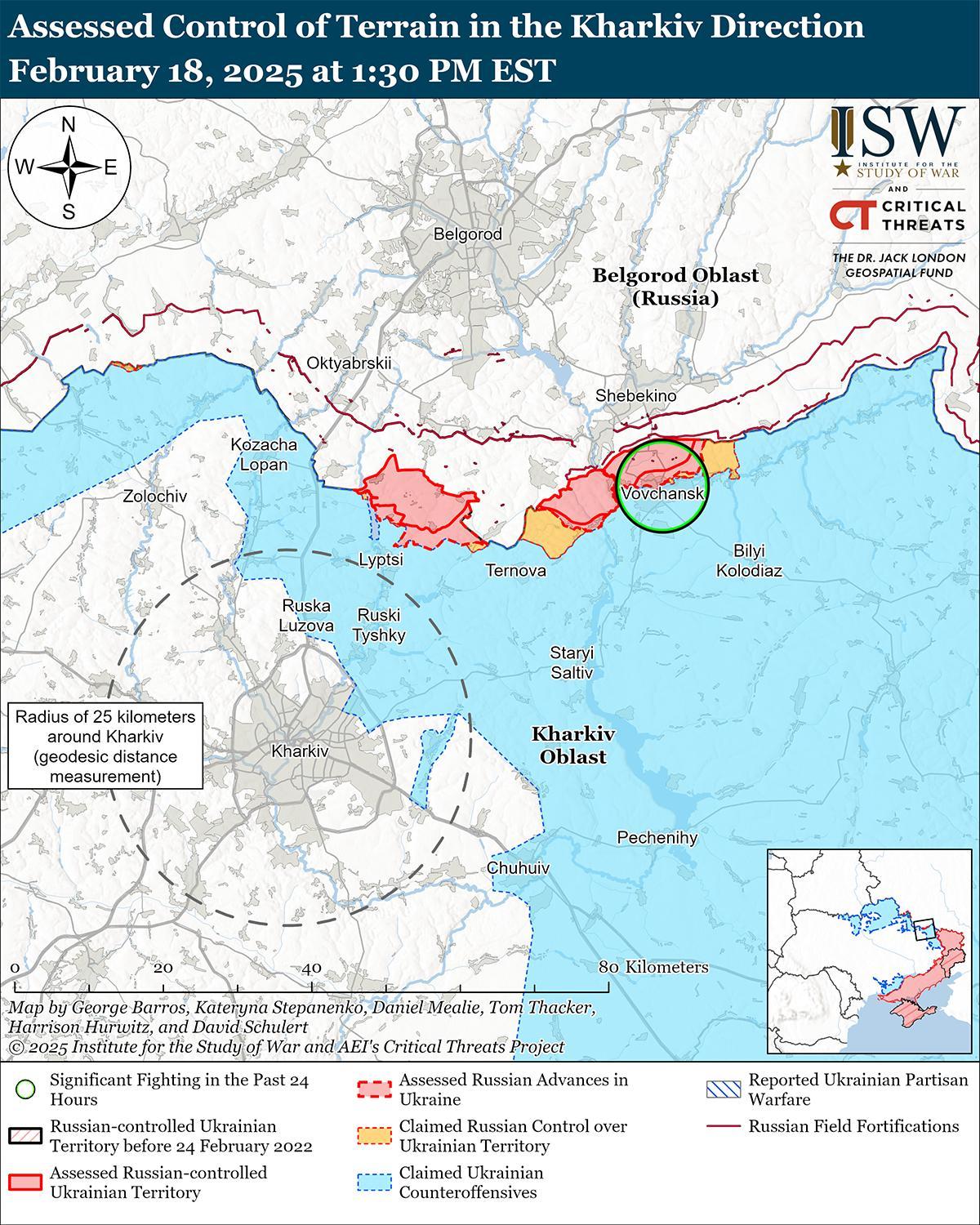 18 февраля враг продолжил наземные атаки на Харьковском направлении, но не продвинулся вперед. 17 и 18 февраля враг вел наступательные действия к северо-востоку от Харькова в районе Волчанска. [42] Харьковская и Хортицкая группировки войск Украины сообщили 18 февраля, что украинские силы отразили российскую механизированную атаку численностью примерно до взвода под Волчанском. [43]
