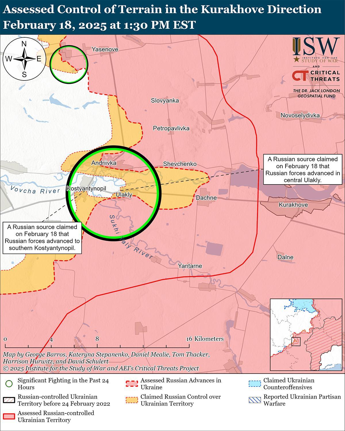 Оценка российского продвижения: Геолоцированные кадры, опубликованные 16 февраля, указывают на то, что российские войска недавно продвинулись к юго-западу от Нового Комара. [78]