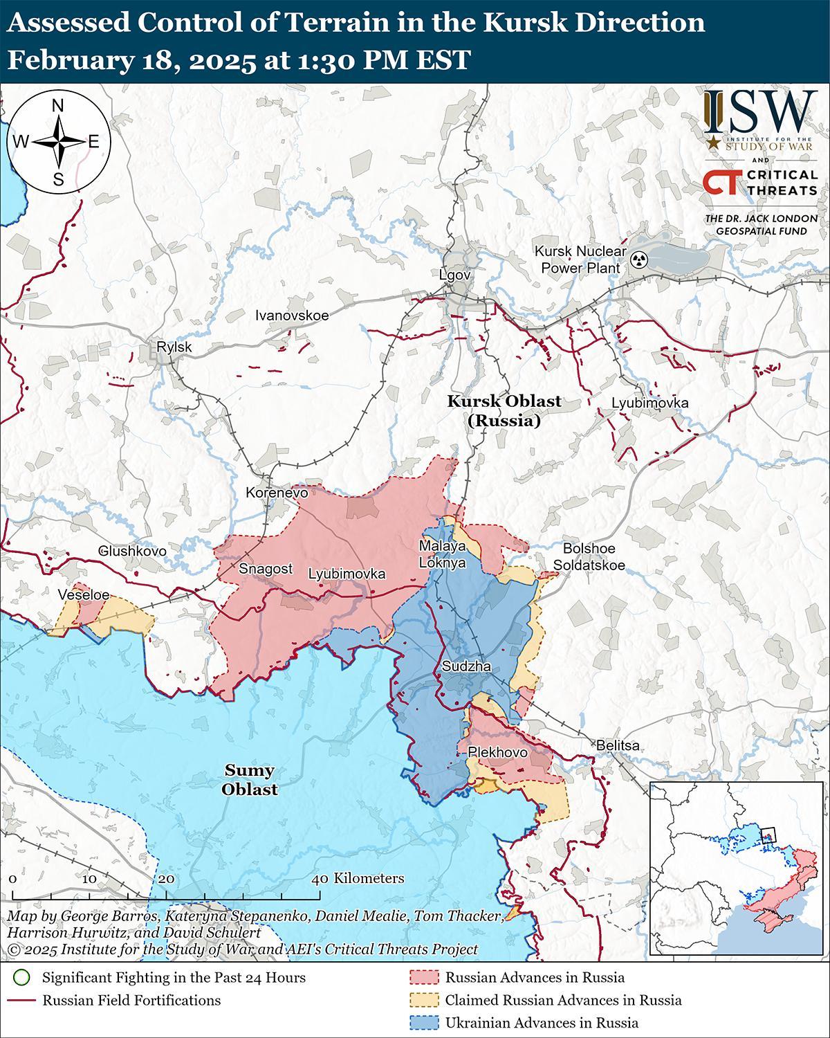 18 февраля российские войска продолжили наступательные действия на Украинском выступе в Курской области, но не добились подтвержденных успехов. Российские войска продолжили наземные атаки к северо-западу от Суджи в районе Свердликово и Погребки, к востоку от Суджи в районе Черкасской Конопелки и к югу от Суджи в районе Куриловки. [36] Российские источники утверждали, что украинские войска продолжали контратаки в Курской области. [37]