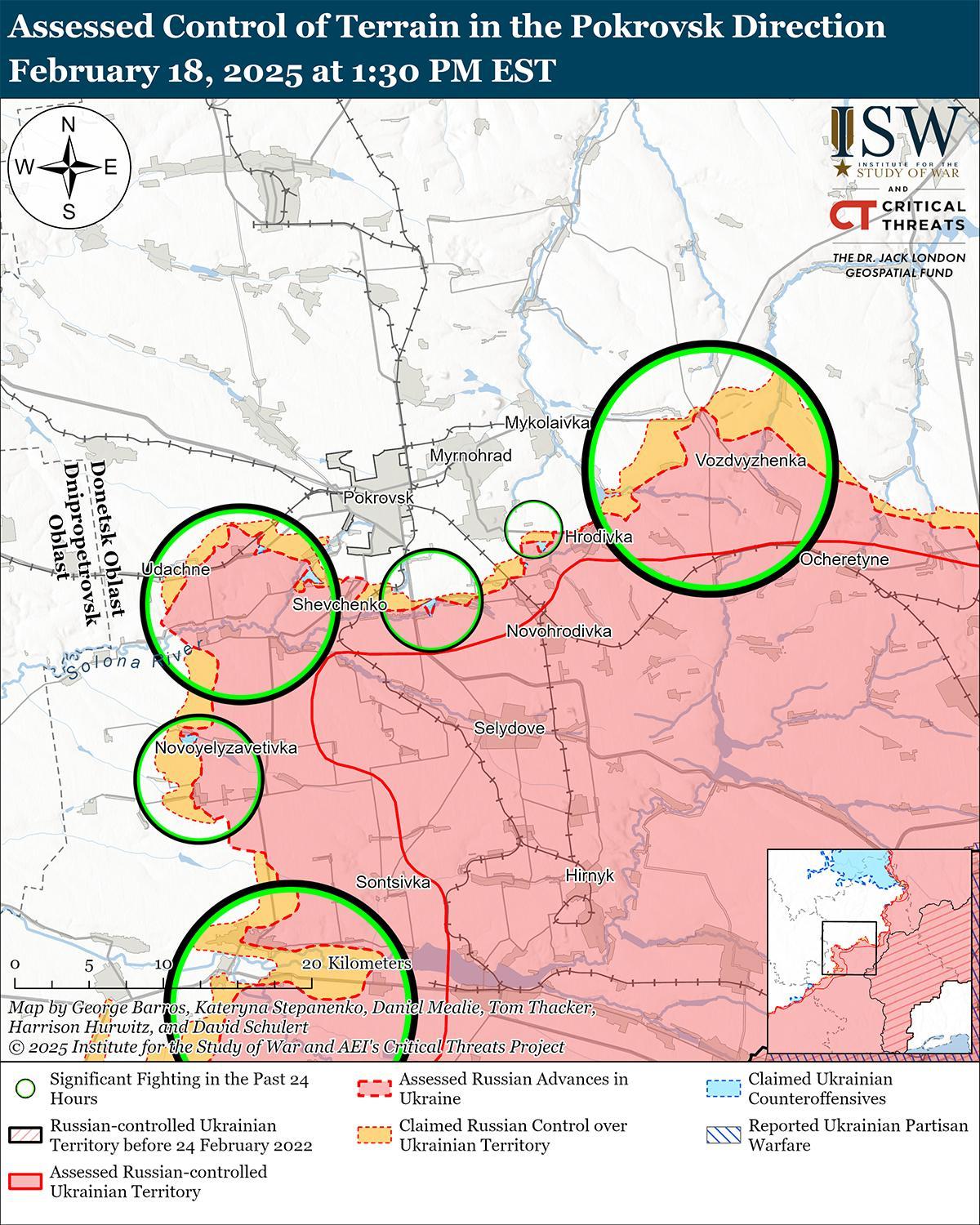 18 февраля враг продолжил наступательные действия на Покровском направлении, но подтвержденных успехов не имел. Враг вел наступательные действия к северо-востоку от Покровска в районах населенных пунктов Водяное Второе, Малиновка и Тарасовка; к востоку от Покровска в районе Миролюбовки, Елизаветовки и Проминя; юго-восточнее Покровска в районе Лысовки; южнее Покровска в районе Новоукраинки; и к юго-западу от Покровска в районе Песчаного, Котлино, Удачного, Успеновки, Надиевки, Ясеново, Новоалександровки, Котляровки, Преображенки и Запорожья 17 и 18 февраля. [62] Российские военные блогеры утверждали, что украинские войска контратаковали вблизи Елизаветовки, Лысовки, Даченского (к югу от Покровска), Котлино и Срибного (к юго-западу от Покровска). [63] Российский источник утверждал, что российские войска нанесли удар по мосту на трассе Т-0515 Покровск – Андреевка в Первое Мая (к юго-западу от Покровска). [64]
