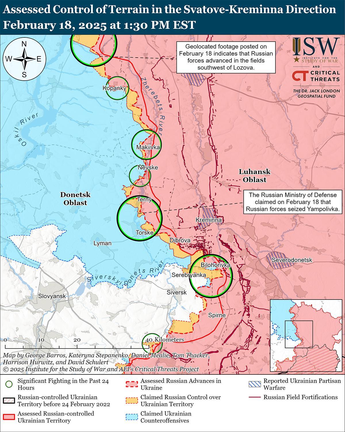 Неподтвержденные заявления России: 18 февраля Министерство обороны России заявило, что российские войска захватили Ямполовку. [51] Российские военные блогеры утверждали, что российские войска продвинулись в районе Терны (к северо-востоку от Лимана) и к югу от Ямполовки. [52]