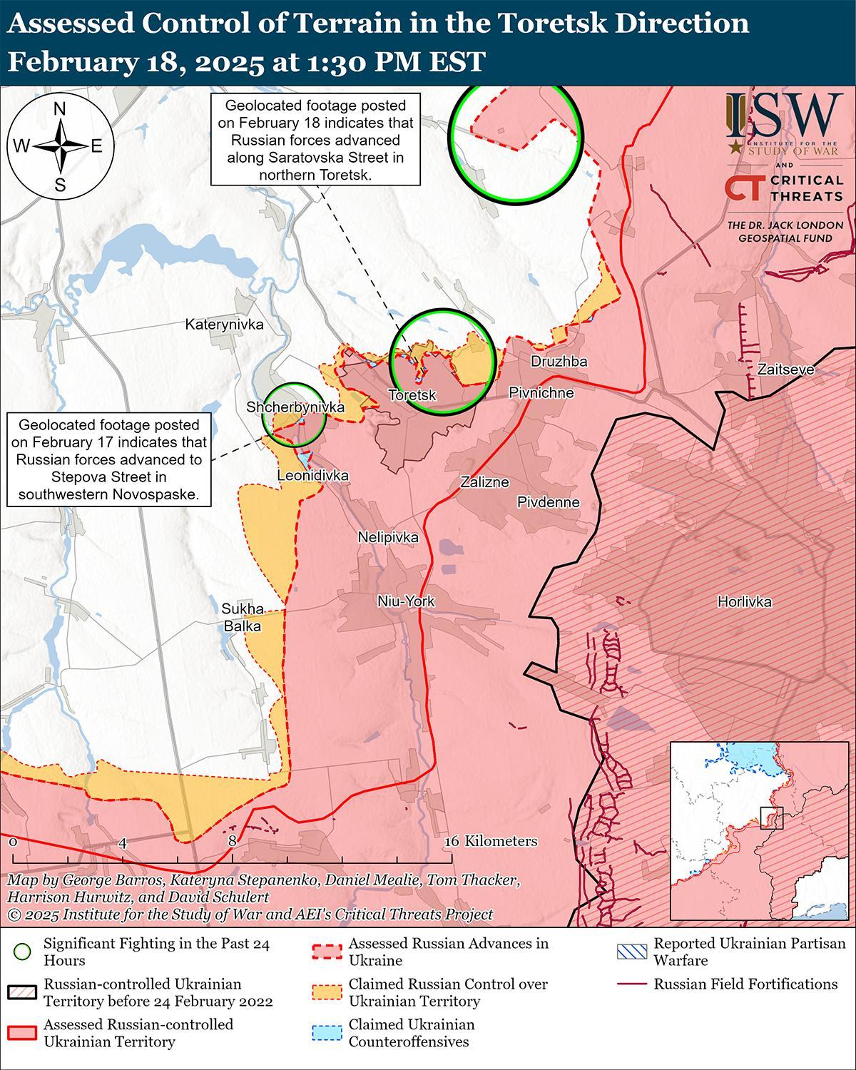 Оценка продвижения российских войск: Геолоцированные кадры, опубликованные 17 и 18 февраля, указывают на то, что российские войска недавно продвинулись в северной части Торецка и на юго-западе Новоспасского (к западу от Торецка). [61]