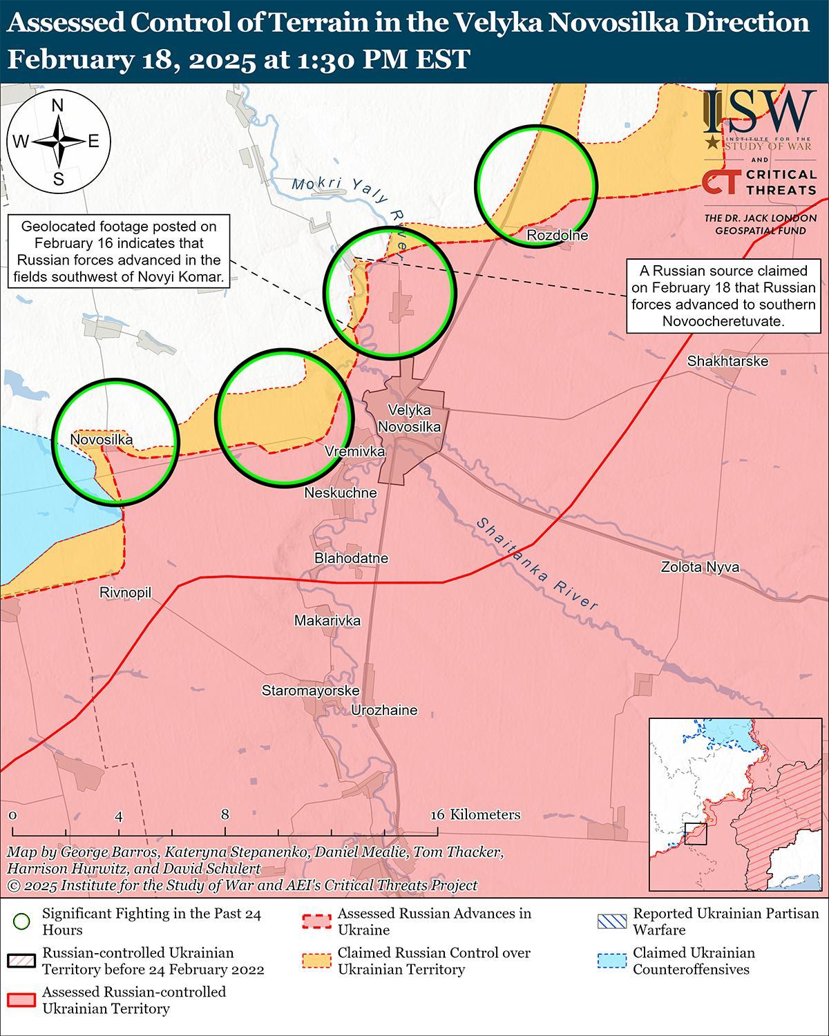 Оценка российского продвижения: 18 февраля Генеральный штаб Украины опубликовал карту, на которой указано, что российские войска недавно продвинулись к юго-востоку от Малой Токмачки (к северо-востоку от Работино). [82]