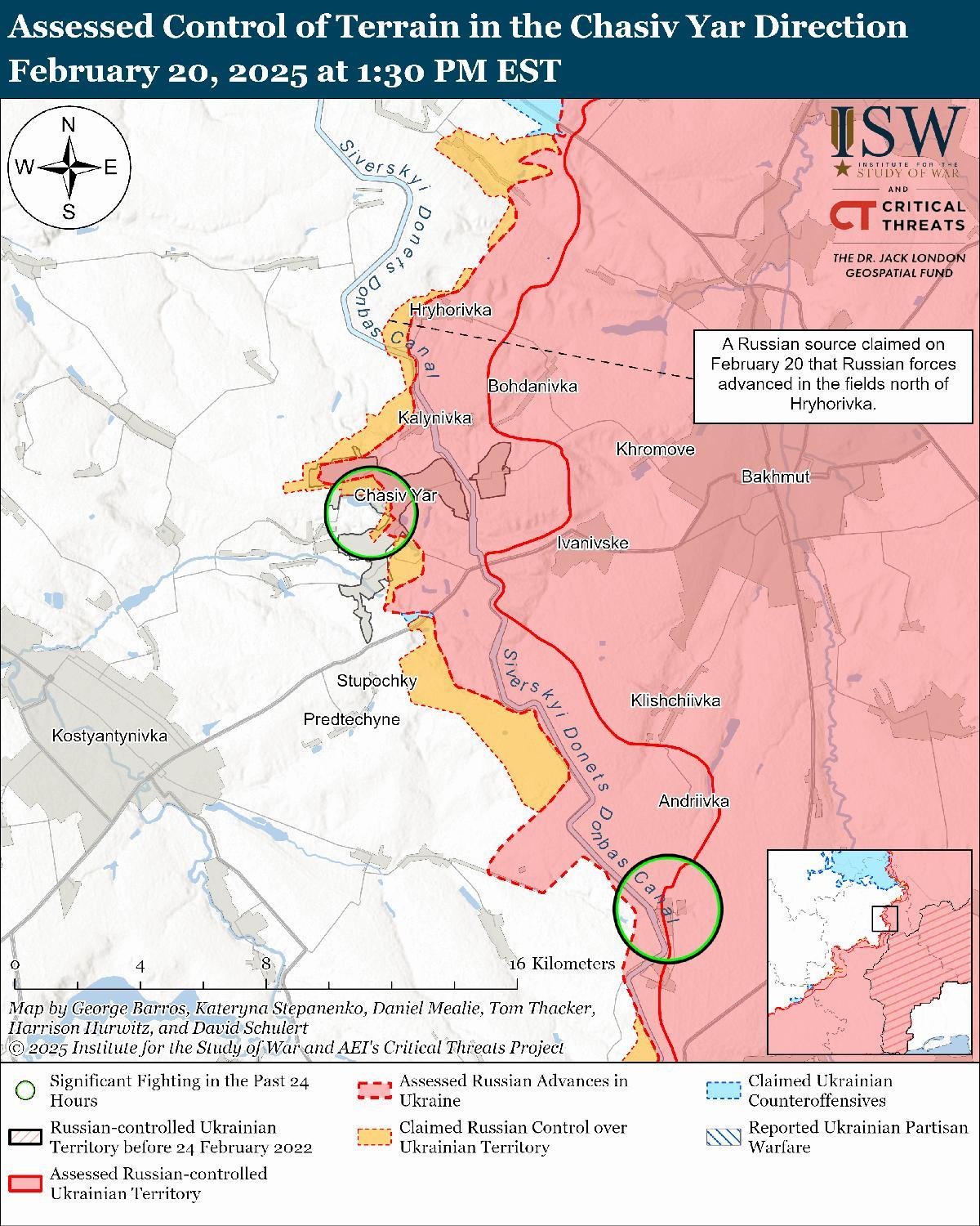 20 февраля враг продолжил наступательные действия на направлении Часова Яра, но не продвинулся вперед. 19 и 20 февраля российские войска продолжили атаки в районах Часова Яра, к северу от Часова Яра в районе Григорьевки, к северо-востоку от Часова Яра в районе Васюковки и к юго-востоку от Часова Яра в районах Курдюмовки и Озаряновки. [37]