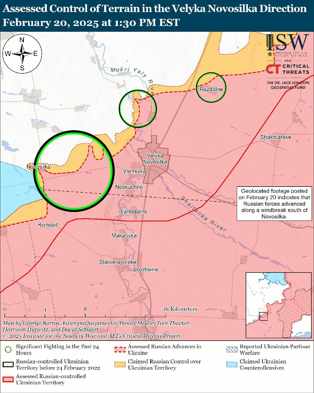Оценка российского продвижения: Геолоцированные кадры, опубликованные 20 февраля, указывают на то, что российские войска недавно продвинулись к югу от Новоселки. [56]