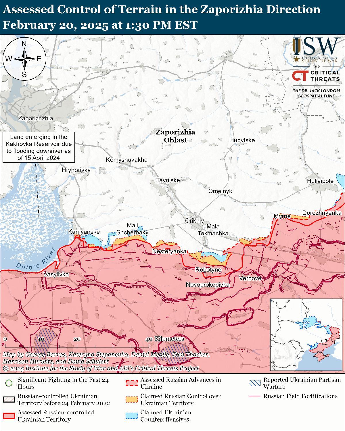 Оценка российского продвижения: Геолоцированные кадры, опубликованные 20 февраля, указывают на то, что российские войска недавно продвинулись в центральной части Запорожья. [44]