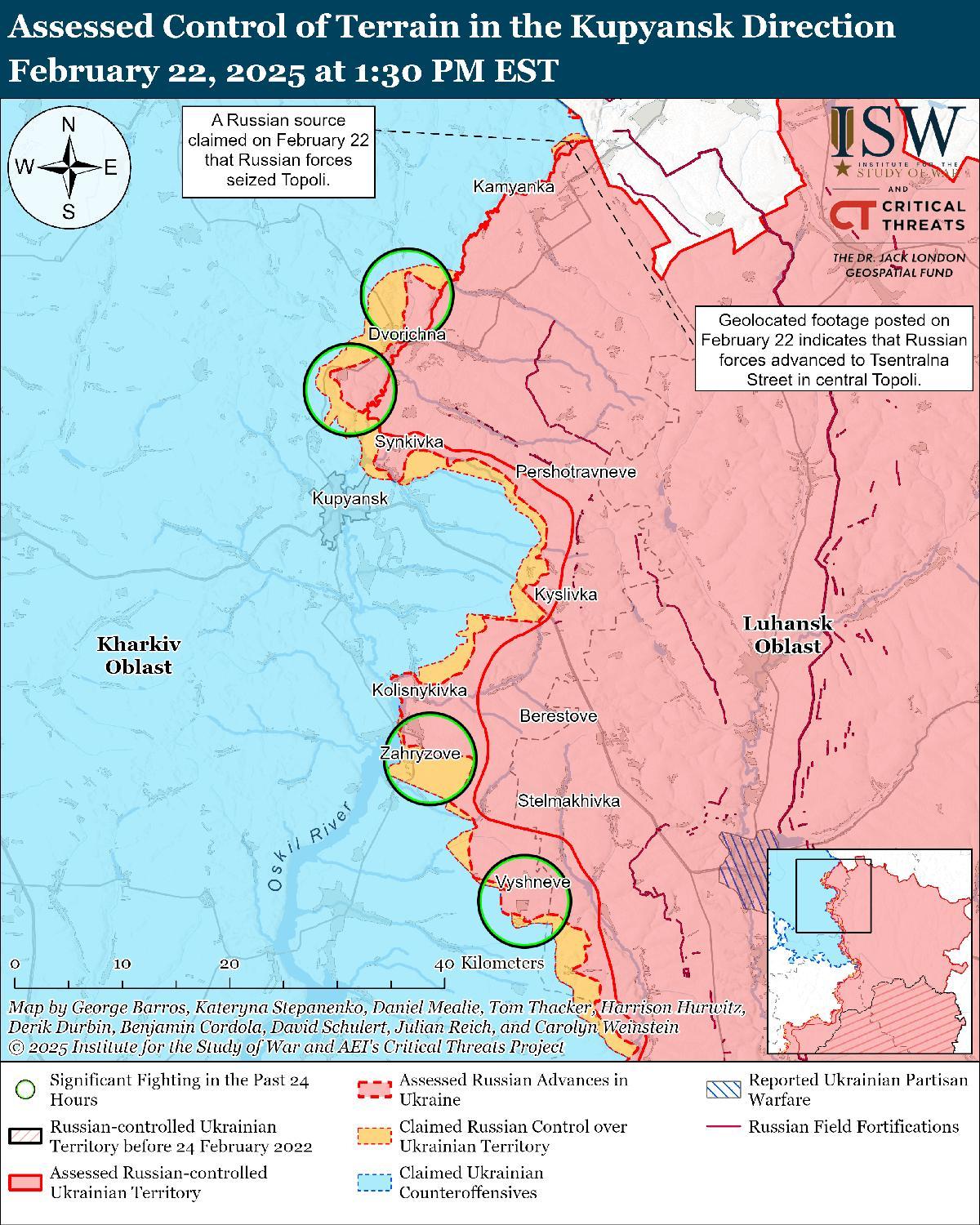 Оценка российского продвижения: Геолоцированные кадры, опубликованные 22 февраля, указывают на то, что российские войска недавно продвинулись в центре Тополи (к северу от Купянска недалеко от международной границы). [15]