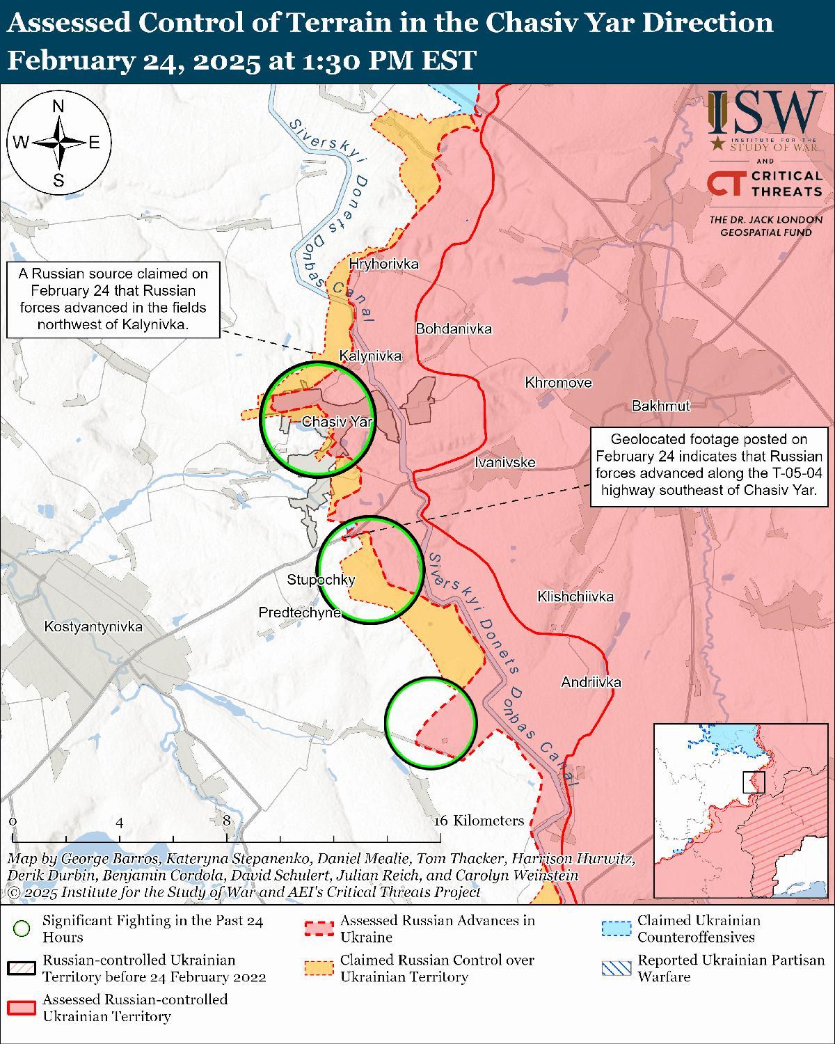 Оценка российского продвижения: Геолоцированные кадры, опубликованные 24 февраля, указывают на то, что российские войска в последнее время продвинулись вдоль трассы Т-0504 Часов Яр – Константиновка к востоку от Часов Яра. [71]