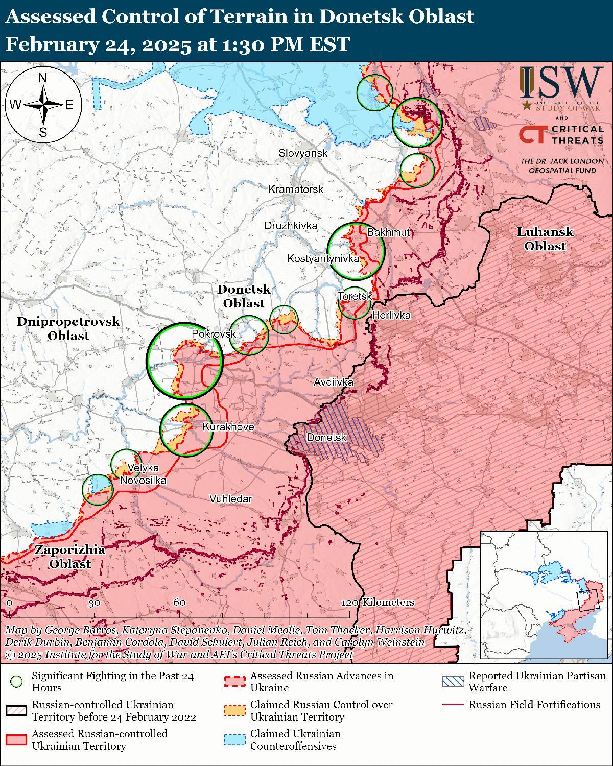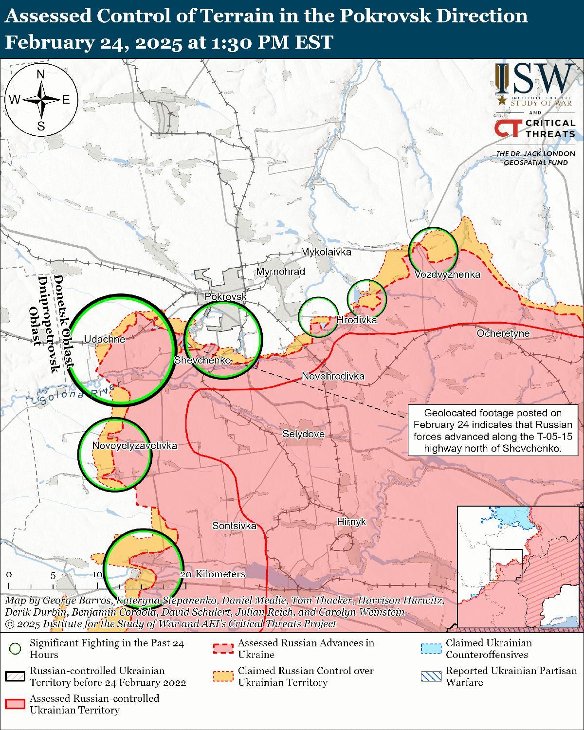 Оценка российского продвижения: Геолоцированные кадры, опубликованные 24 февраля, указывают на то, что российские войска недавно продвинулись к северу от Шевченко (к юго-западу от Покровска) вдоль трассы Т-0515 Покровск-Андреевка. [79]