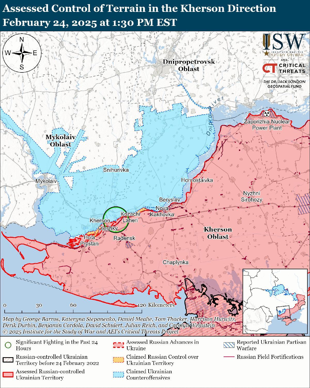 Президент России Владимир Путин отдал приказ о неспровоцированном полномасштабном вторжении в Украину три года назад, 24 февраля 2022 года. Украина не была побеждена или уничтожена, но остается стойкой и инновационной перед лицом этой неоправданной российской агрессии. Путин начал полномасштабное вторжение в Украину в неудачной попытке захватить Киев, свергнуть демократически избранное правительство Украины и силой установить пророссийское прокси-правительство за три дня. Украинские войска при поддержке коалиции союзников, включая Соединенные Штаты и европейских партнеров, с тех пор успешно вытеснили российские войска с севера Украины и освободили значительную территорию на юге и северо-востоке Украины. Главнокомандующий войсками Украины генерал Александр Сырский сообщил 24 февраля, что украинские войска вернули себе более 50 процентов территории, которую российские войска оккупировали с 24 февраля 2022 года. [1] ISW зафиксировал подтверждение того, что украинские войска вернули 50,03 процента территории, которую российские войска захватили с 24 февраля 2022 года. В прошлом году российские войска медленно и постепенно, но неуклонно продвигались вперед на востоке Украины благодаря значительным преимуществам России в живой силе и технике, а также способности России использовать задержки в оказании западной помощи Украине. Украинские войска используют свои технологические преимущества и интегрируют технологические инновации с наземными операциями, чтобы замедлить российские успехи. Украина продолжает совершенствовать и внедрять инновации в свои боевые возможности и работает над тем, чтобы стать самодостаточной в долгосрочной перспективе, но западная и международная военная поддержка Украины в краткосрочной и среднесрочной перспективе остается решающей для способности Украины защищаться от российской агрессии. Защита Украины и сохранение Украины как независимой, суверенной и демократической страны, способной защитить себя от России, является важнейшей частью сдерживания более широкой российской агрессии против Запада. Соединенные Штаты, Европа и другие западные союзники должны продемонстрировать приверженность Украине посредством своевременной и надежной военной помощи, продолжать позволять украинским силам оказывать значительное давление на Россию и заставить Путина отказаться от завоевания Украины и своих более широких амбиций в Европе ради достижения устойчивого мира.