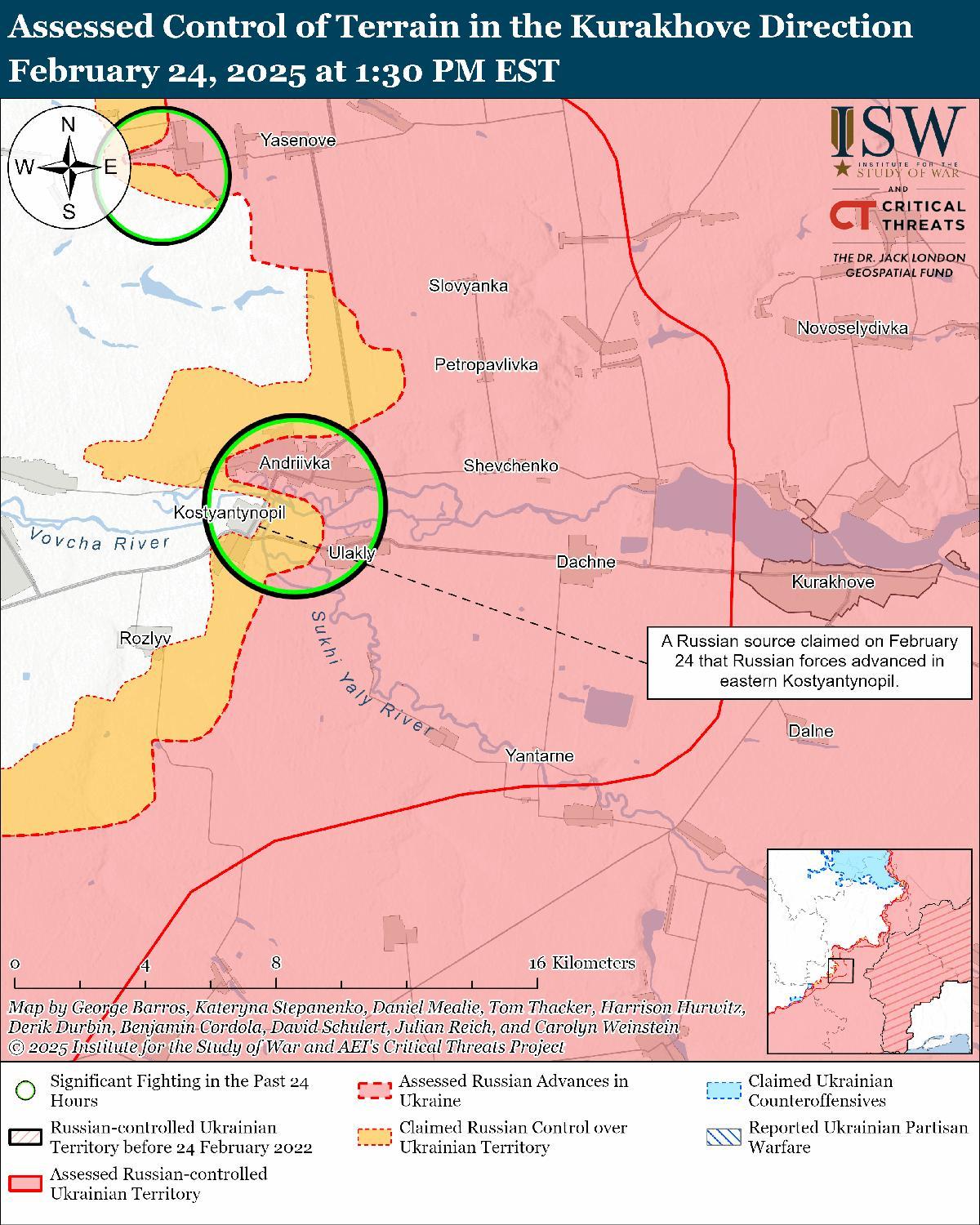 24 февраля враг продолжил наступательные действия на Кураховском направлении, но не продвинулся вперед. 23 и 24 февраля враг продолжил наступление к западу от Курахово в районах населенных пунктов Андреевка, Константинополь и Улаклы. [86]