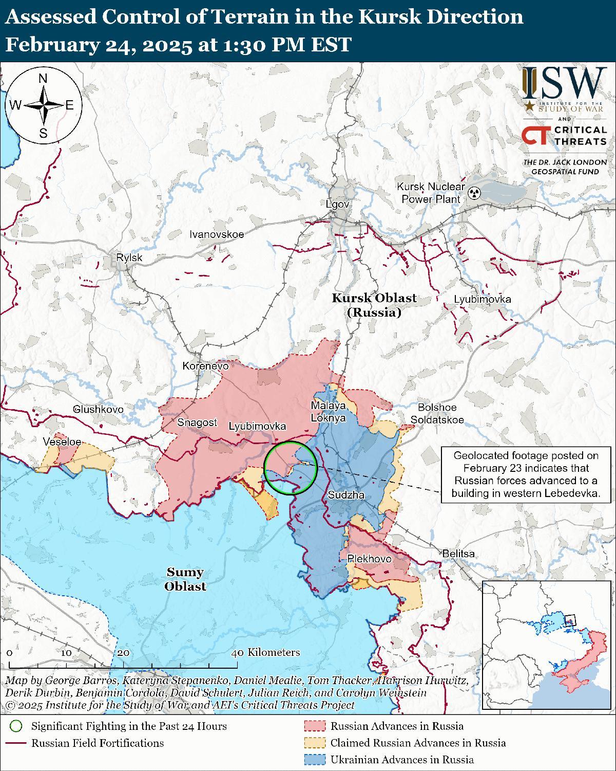 В последнее время российские войска продвинулись в Курской области. Враг атаковал приграничную территорию на северо-востоке Сумской области в районе Журавки; северо-западнее Суджи в районе Свердликово, Лебедевки, Никольского, Малой Локни и Погребки; и юго-восточнее Суджи в районе Черкасской Конопелки и Фанасеевки. [38] 24 февраля связанный с Кремлем российский военный блогер заявил, что украинские войска контратаковали на трассе H-07 Юнаковка-Суджа. [39]