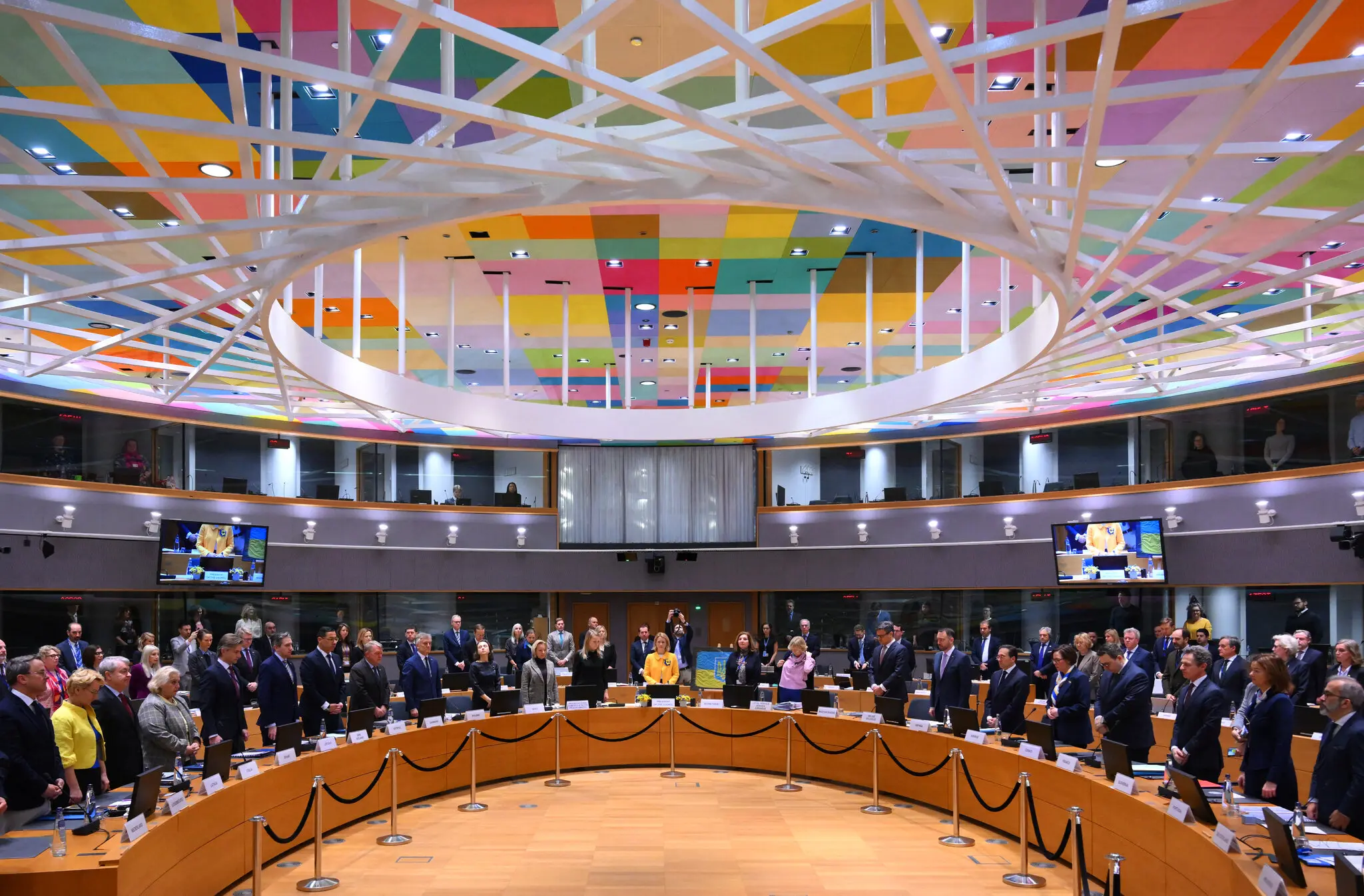 Кайя Каллас, главный дипломат Европейского союза, в центре в желтом, и министры иностранных дел ЕС в Брюсселе в понедельник почтили минутой молчания третью годовщину российского вторжения в Украину. Фото…Джон Тис/Agence France-Presse — Getty Images