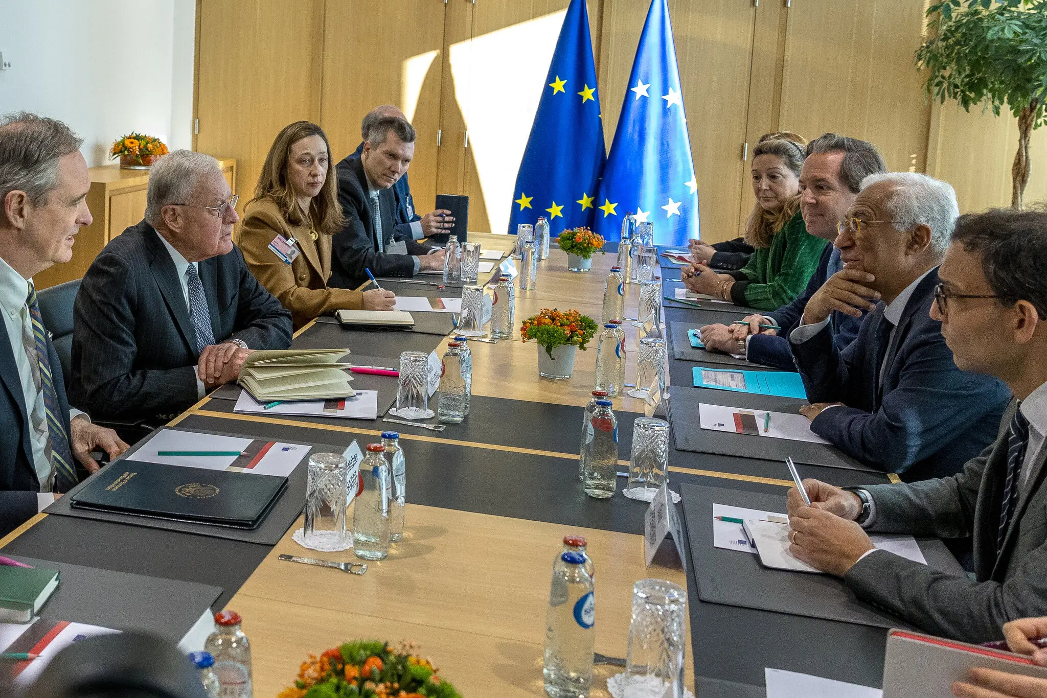 Председатель Европейского совета Антониу Кошта (правоцентрист) беседует со специальным посланником США по Украине и России Китом Келлогом во время встречи 18 февраля в Брюсселе. Фото…Омар Гавана/Getty Images