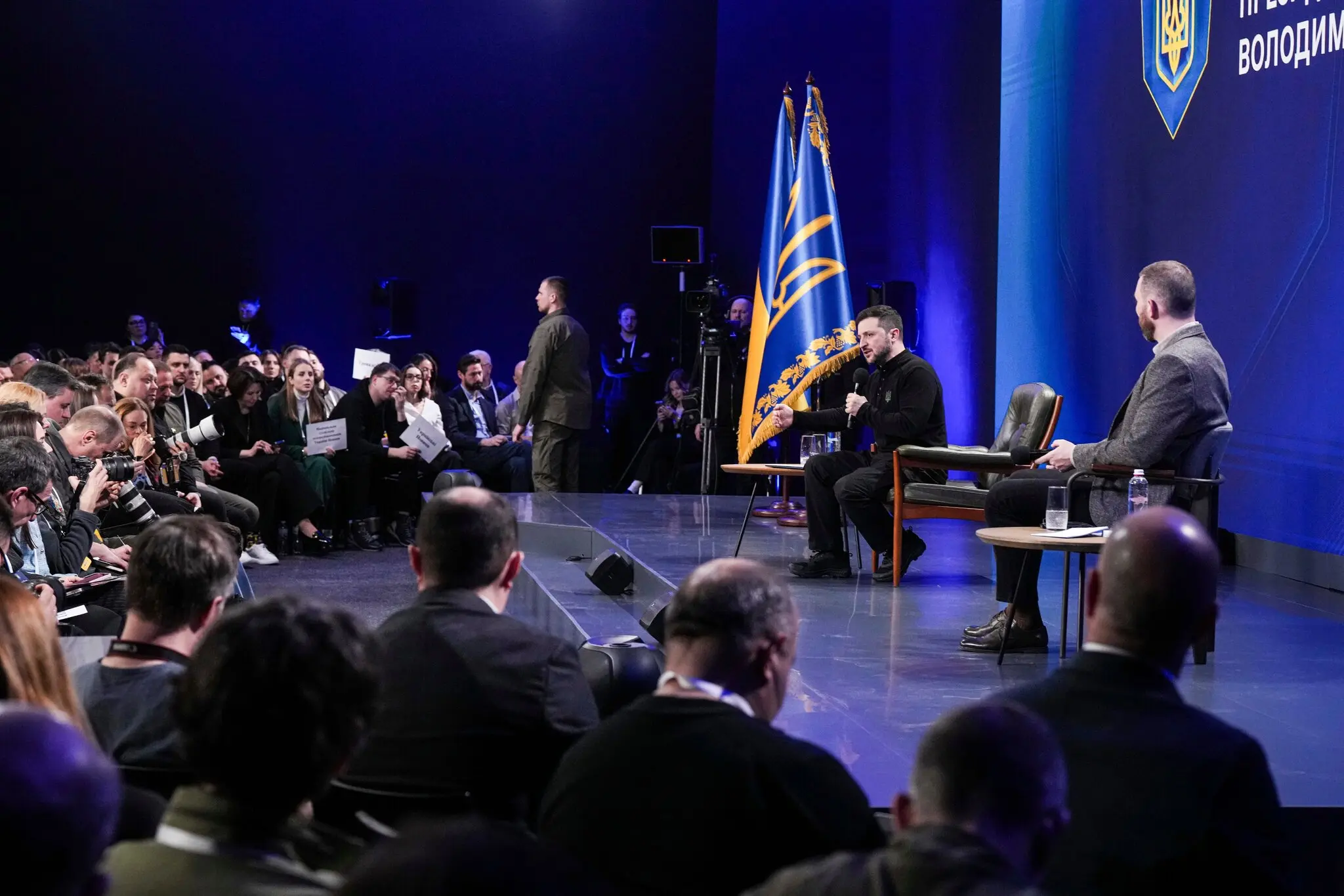 Президент Украины Владимир Зеленский выступает на пресс-конференции в Киеве в воскресенье. Фото…Евгений Малолетка/Ассошиэйтед Пресс