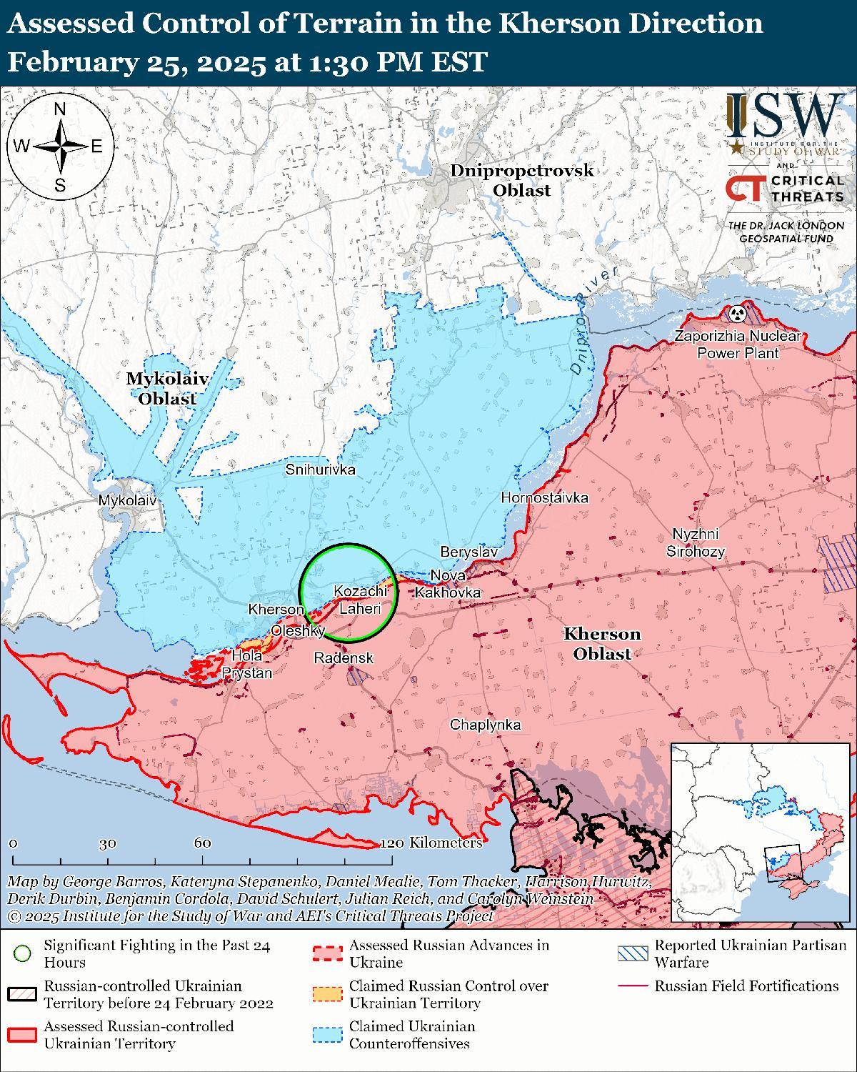 25 февраля враг продолжил ограниченные наземные атаки на Херсонском направлении, но не продвинулся вперед. 24 и 25 февраля российские войска атаковали в направлении Садового (к востоку от Херсона на западном [правобережье] Херсонской области). [89]