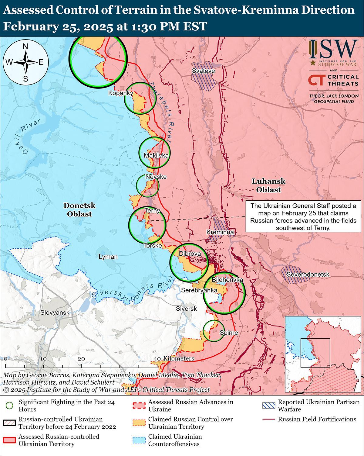 Оценка российского продвижения: 25 февраля Генеральный штаб Украины опубликовал карту, на которой указано, что российские войска продвинулись к юго-западу от Терны (к северо-востоку от Лимана). [44]
