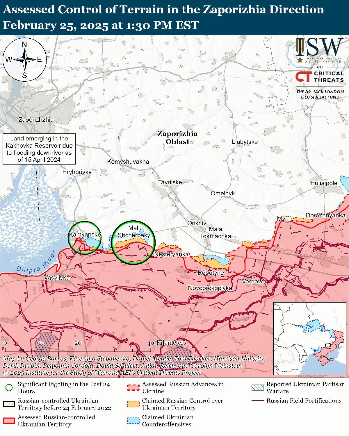 25 февраля российские войска продолжили наступательные действия на западе Запорожской области, но подтвержденных успехов не имели. 24 и 25 февраля враг атаковал к северо-западу от Работино в районе Каменского, Малых Щербаков и Пятихаток. [82] Российский источник утверждал, что украинские войска контратакуют в районе Лобкового и Степного (оба к северо-западу от Работино). [83]