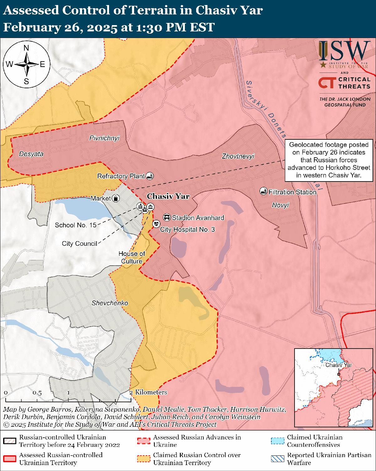 Оценка российского продвижения: Геолоцированные кадры, опубликованные 26 февраля, указывают на то, что российские войска недавно продвинулись вдоль улицы Горького в западной части Часова Яра. [39]