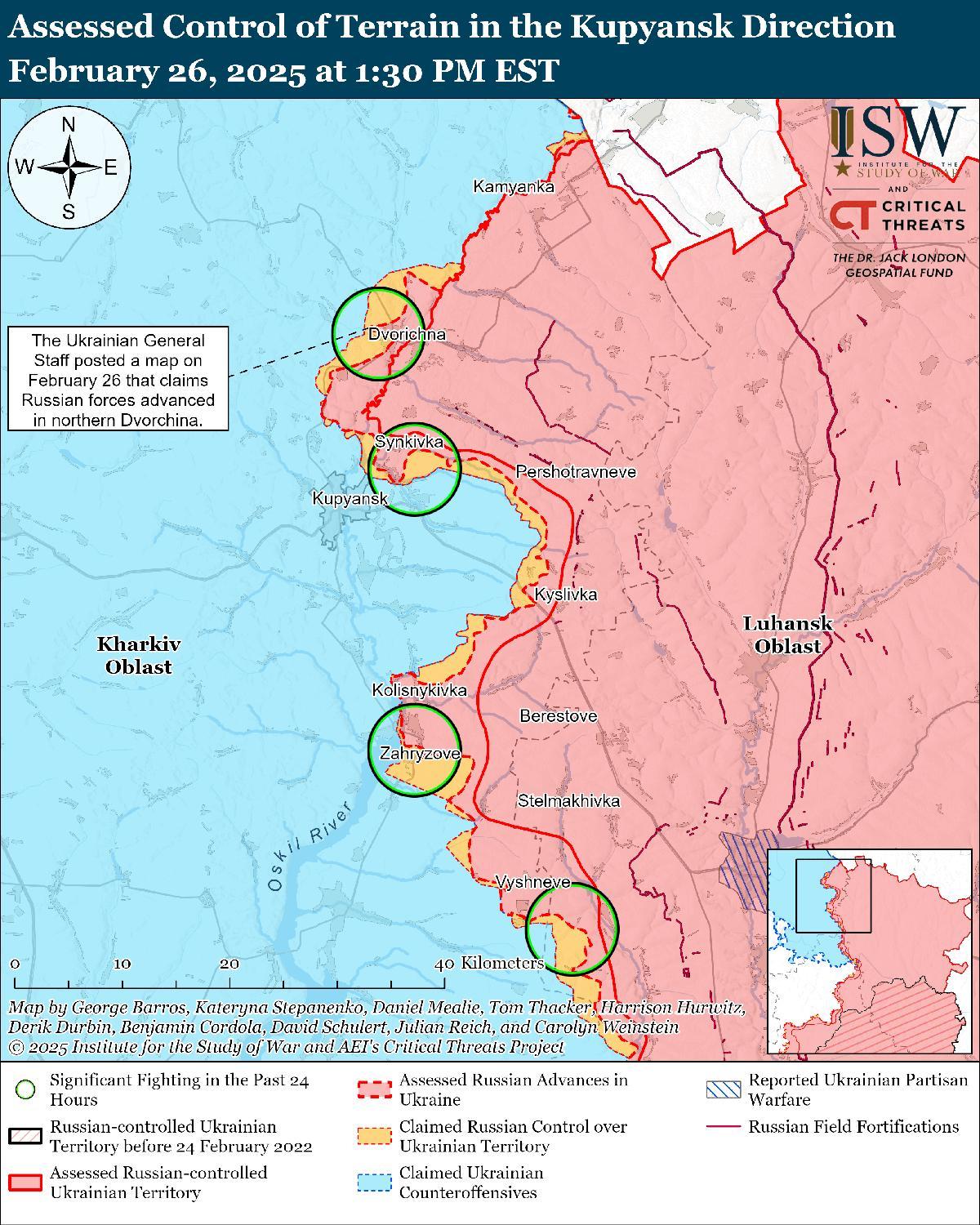 В последнее время российские войска продвинулись на Купянском направлении. 25 и 26 февраля враг вел наступательные действия к северу от Купянска в районах населенных пунктов Двуречная, Радьковка и Кондрашовка и к востоку от Купянска в районе Петропавловки. [25] 26 февраля российский военный блогер заявил, что украинские войска контратаковали между Двуречной и Западным (к северу от Купянска). [26]