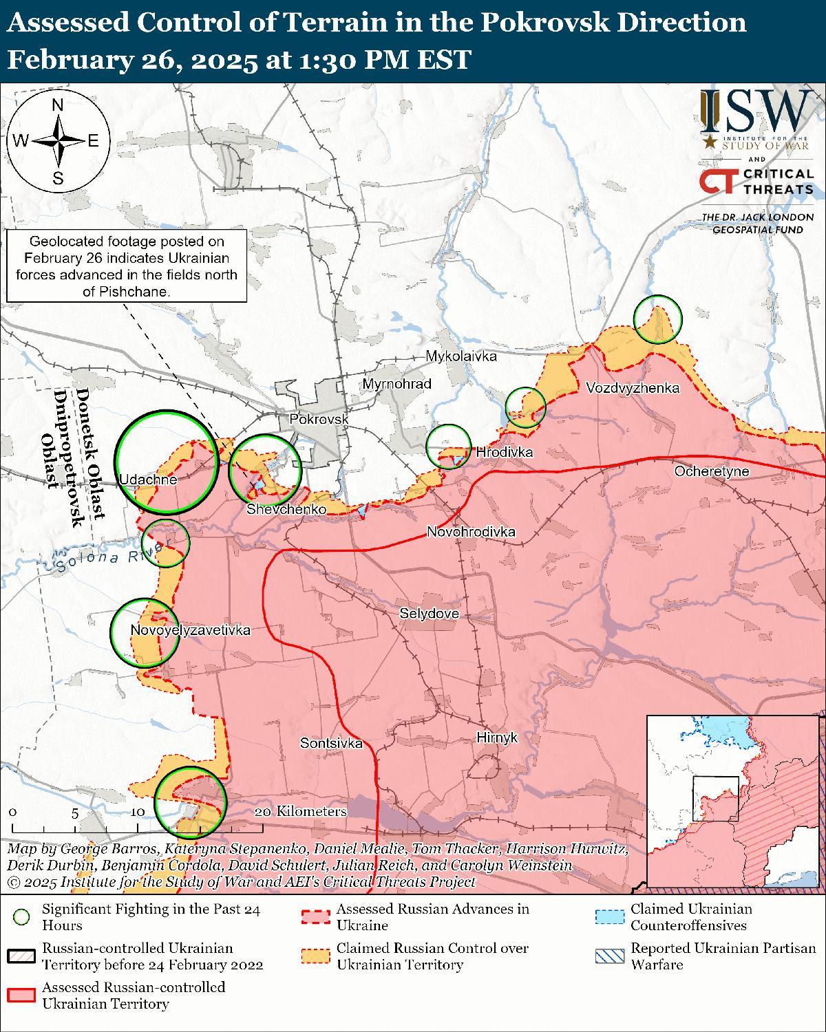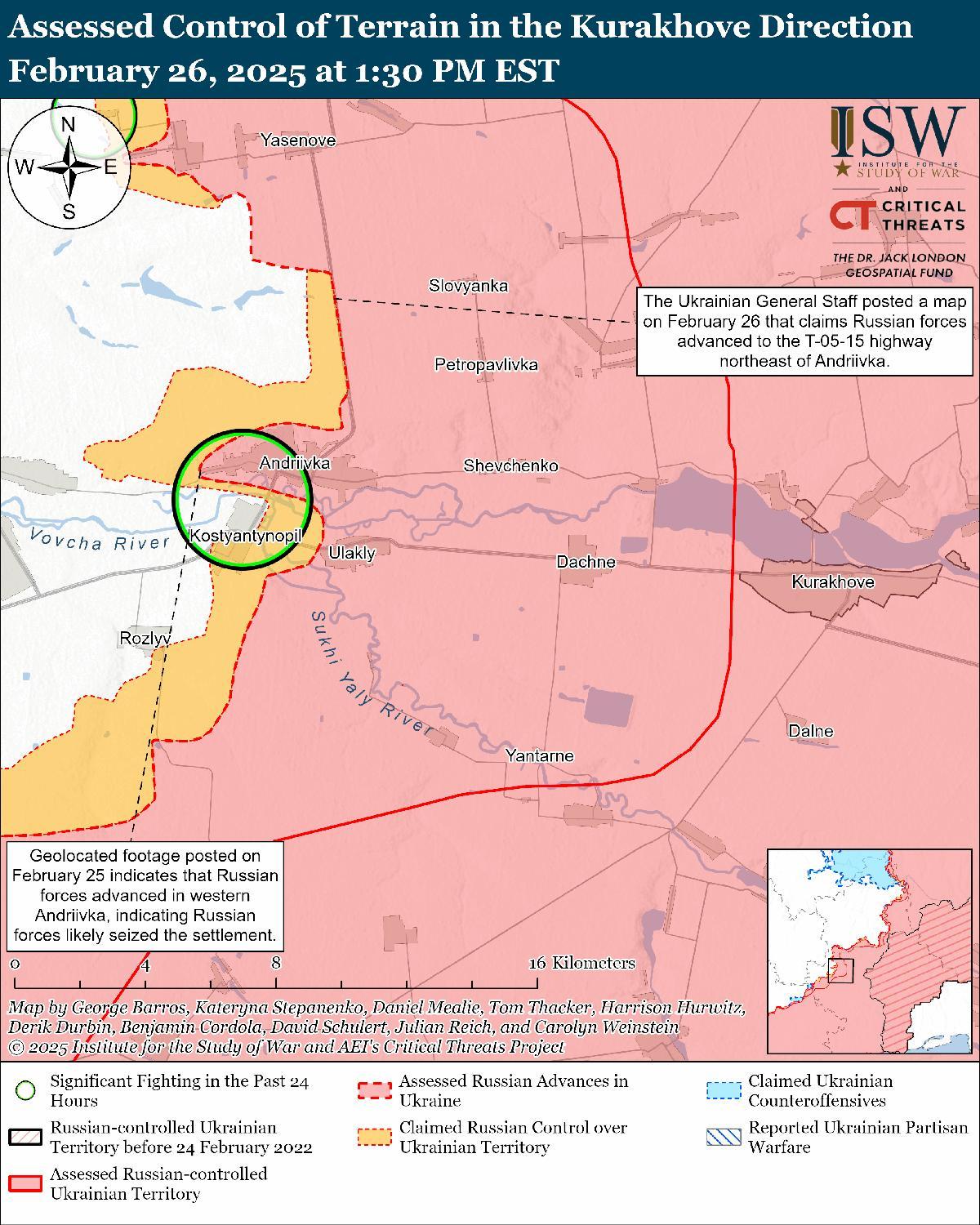 Оценка российского продвижения: 26 февраля Генеральный штаб Украины опубликовал карту, на которой указано, что российские войска недавно продвинулись к трассе Т-0515 Покровск-Андреевка к северо-востоку от Андреевки. [52] На геолоцированных кадрах, опубликованных 25 февраля, видно, как украинские войска наносят удары по оккупированному Россией зданию в западной части Андреевки, что указывает на то, что российские войска недавно захватили населенный пункт. [53]