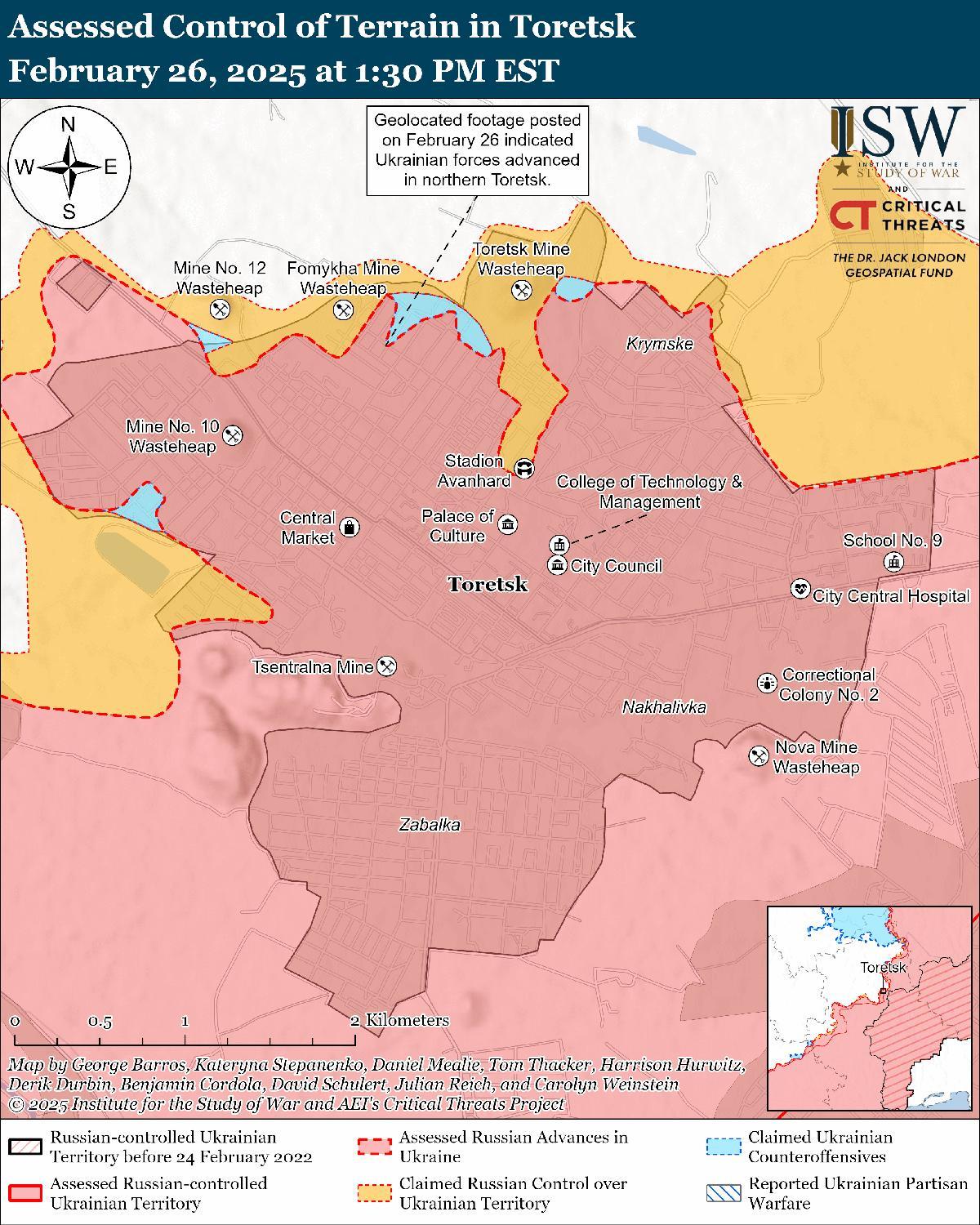 Оценка украинского продвижения: Геолоцированные кадры, опубликованные 26 февраля, указывают на то, что украинские войска недавно продвинулись вдоль улиц Чайковского и Карла Либкнехта на севере Торецка. [41]