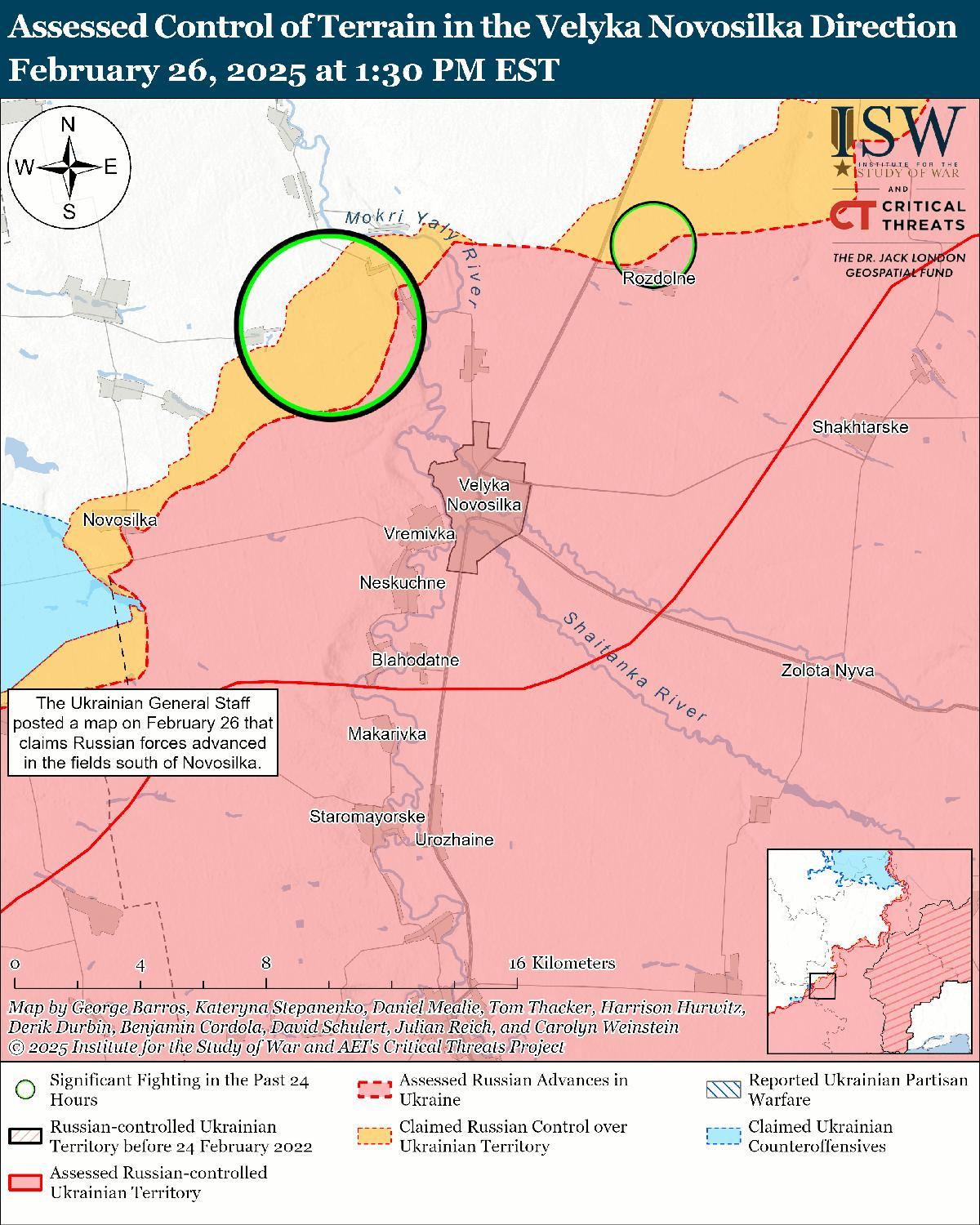 Оценка продвижения российских войск: 26 февраля Генеральный штаб Украины опубликовал карту, на которой указано, что российские войска продвинулись к югу от Новоселки (к западу от Великой Новоселки). [56]