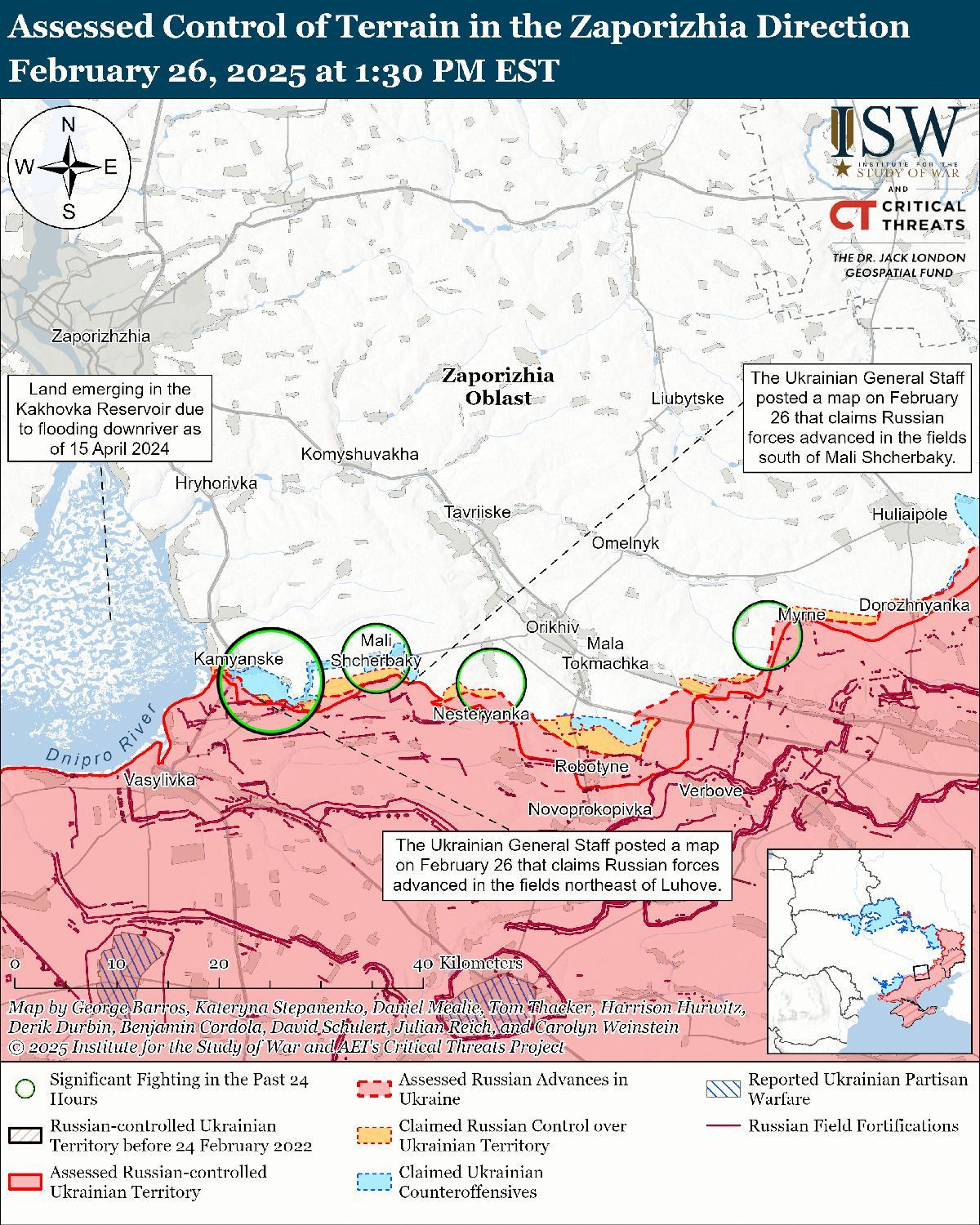 Оценка российского продвижения: 26 февраля Генеральный штаб Украины опубликовал карту, на которой указано, что российские войска недавно продвинулись к югу от Щербаков и к северо-востоку от Луговое (оба к северо-западу от Работино). [59]