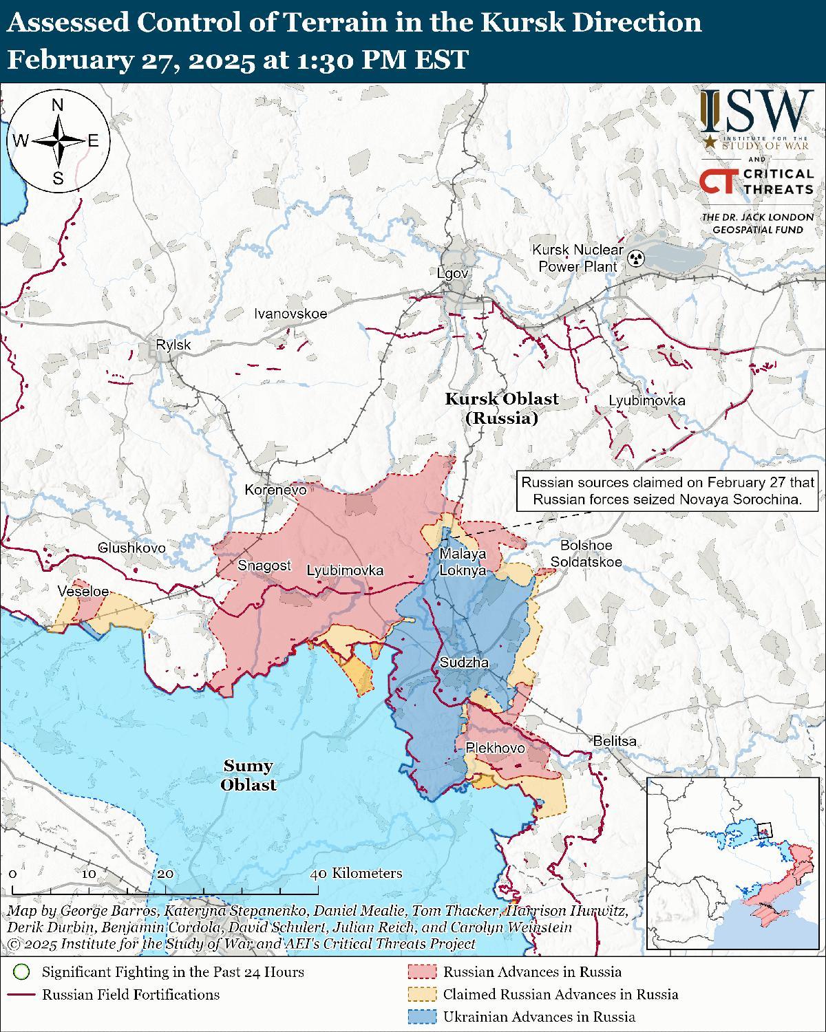 Неподтвержденные заявления России: 27 февраля Министерство обороны России заявило, что российские войска захватили Никольское (к северу от Суджи). [27] Российские военные блогеры утверждали, что российские войска захватили Новую Сорочину (к северо-западу от Суджи) и продвинулись к югу от населенного пункта. [28]