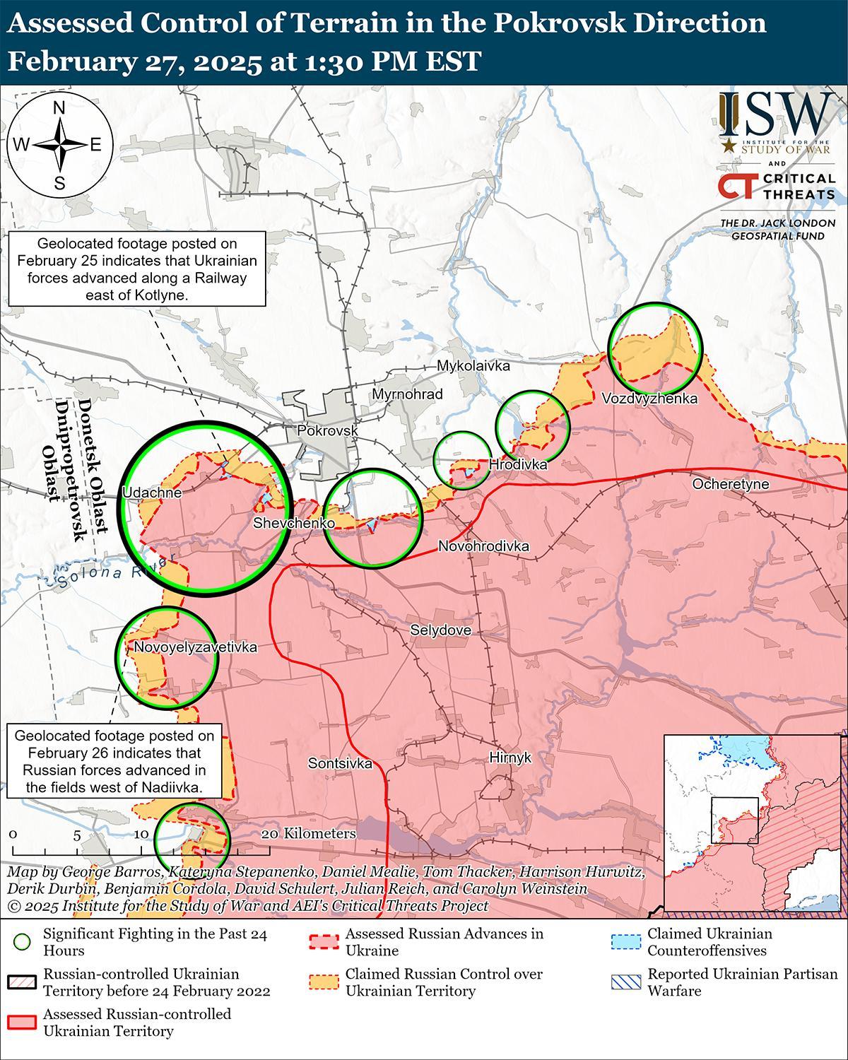 Украинские и российские войска в последнее время продвинулись на Покровском направлении. Враг продолжил атаки к северо-востоку от Покровска в районах населенных пунктов Тарасовка и Водяное Второе; к востоку от Покровска в районе Новоторецкого, Миролюбовки и Проминя; юго-восточнее Покровска в районе Лысовки; южнее Покровска в районе Даченского; и к юго-западу от Покровска в районе Зверево, Леонтовичи (ранее Первое Мая), Котлино, Удачное, Надиевка, Успеновка, Песчаное, Преображенка, Новоалександровка и Запорожье 26 и 27 февраля. [51] Российские военные блогеры утверждали, что украинские войска контратаковали в районах населенных пунктов Котлино, Успеновка и Удачное. [52]