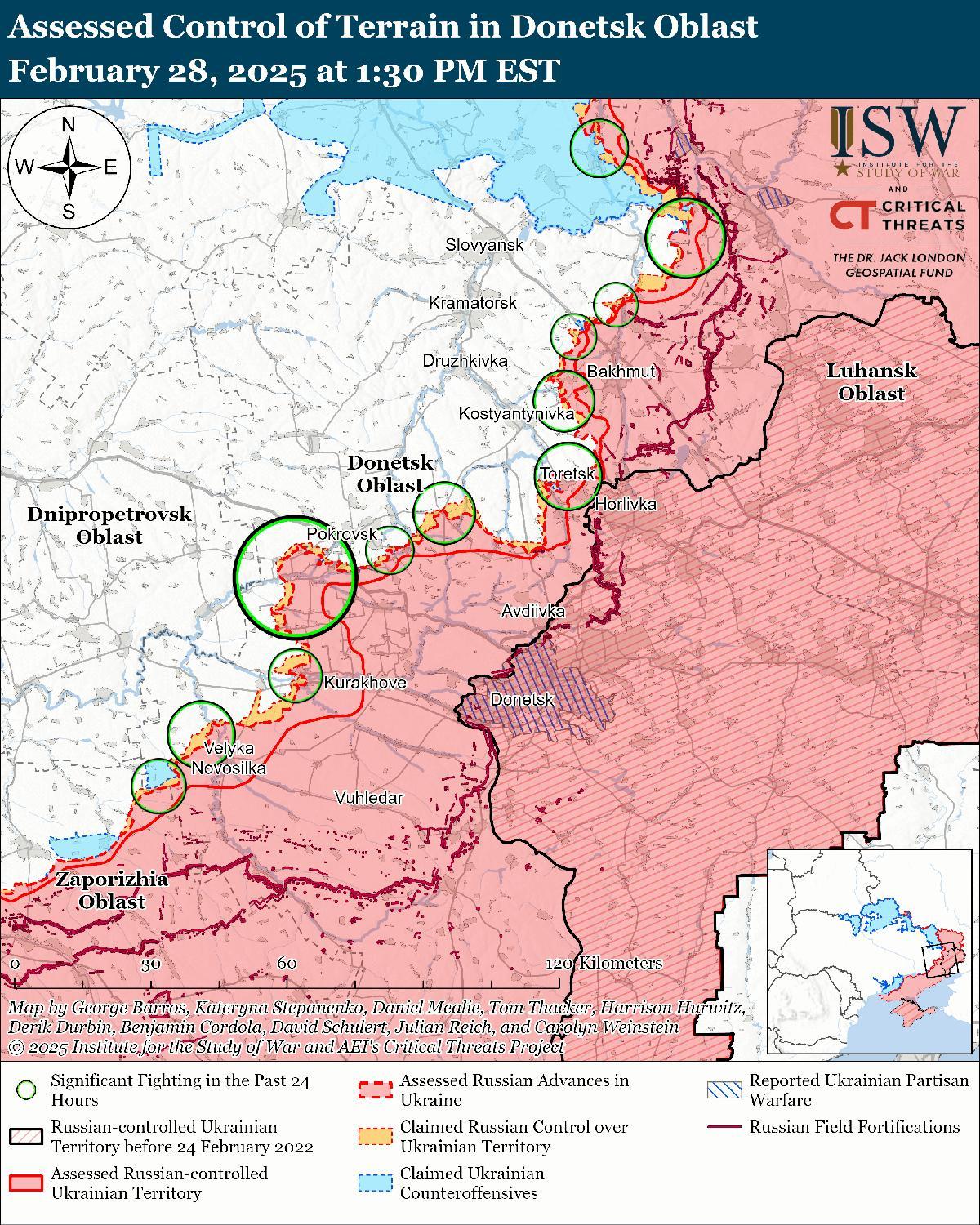 В последнее время российские войска продвинулись на Покровском направлении. Российские войска атаковали под самим Покровском; северо-восточнее Покровска в районе Тарасовки; к востоку от Покровска в районе Миролюбовки, Елизаветовки, Проминя и Березовки; юго-восточнее Покровска в районе Лысовки; южнее Покровска в районе Новоукраинки; и юго-западнее Покровска в районе Зверево, Котлино, Удачного, Надиевки, Успеновки, Песчаного, Преображенки, Богдановки и Новоалександровки 27 и 28 февраля. [50] Российские военные блогеры утверждали, что украинские войска контратаковали в районе Новоалександровки и Новосергиевки (к юго-западу от Покровска). [51]