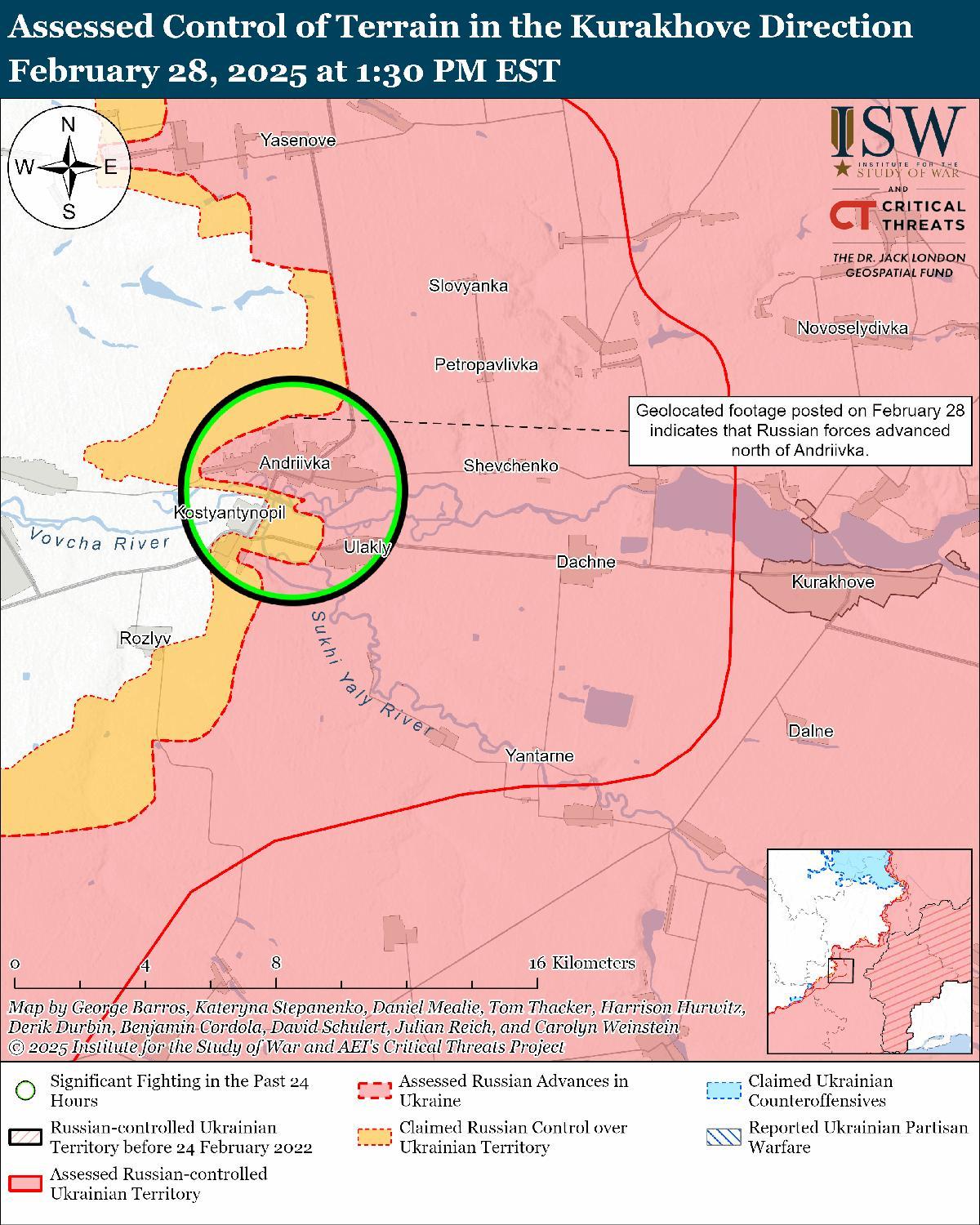 Оценка российского продвижения: Геолоцированные кадры, опубликованные 27 февраля, указывают на то, что российские войска незначительно продвинулись к северу от Андреевки (к западу от Курахово). [56]
