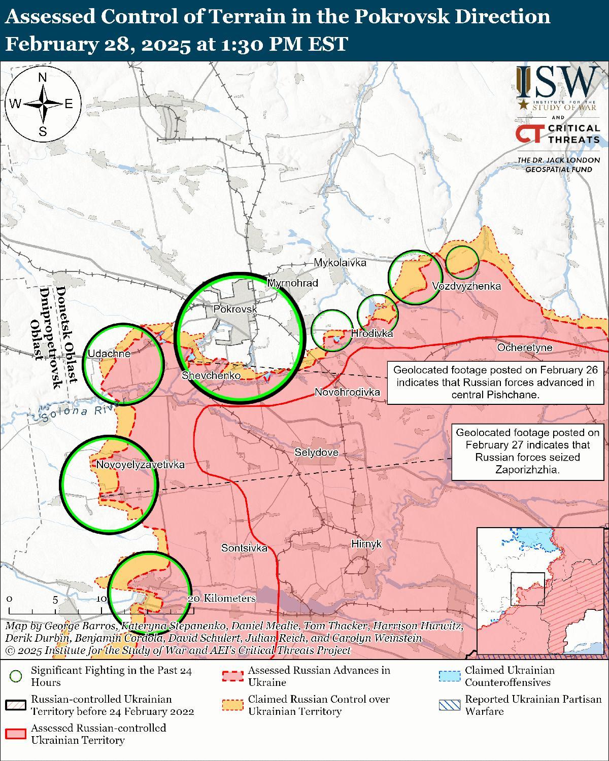 Оценка российского продвижения: Геолоцированные кадры, опубликованные 26 и 27 февраля, указывают на то, что российские войска недавно продвинулись в центральном Песчаном и захватили Запорожье (к юго-западу от Покровска). [52]