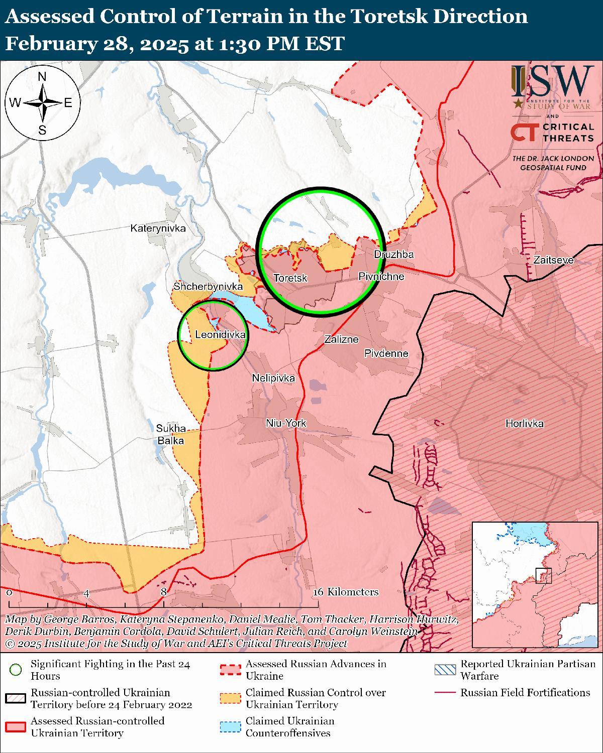 28 февраля враг продолжил наступательные действия на Торецком направлении, но не продвинулся вперед. Российские войска продолжали наступление в районе самого Торецка; севернее Торецка в районе Крымского; северо-восточнее Торецка в районе Дачного; западнее Торецка в районе Щербиновки; и юго-западнее Торецка в районе Леонидовки 27 и 28 февраля. [46] Российские военные блогеры утверждали, что украинские войска контратаковали на западных окраинах Торецка и в Щербиновке. [47]