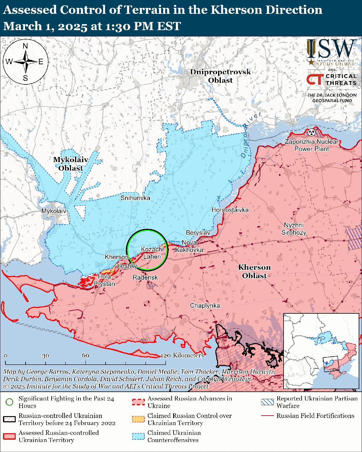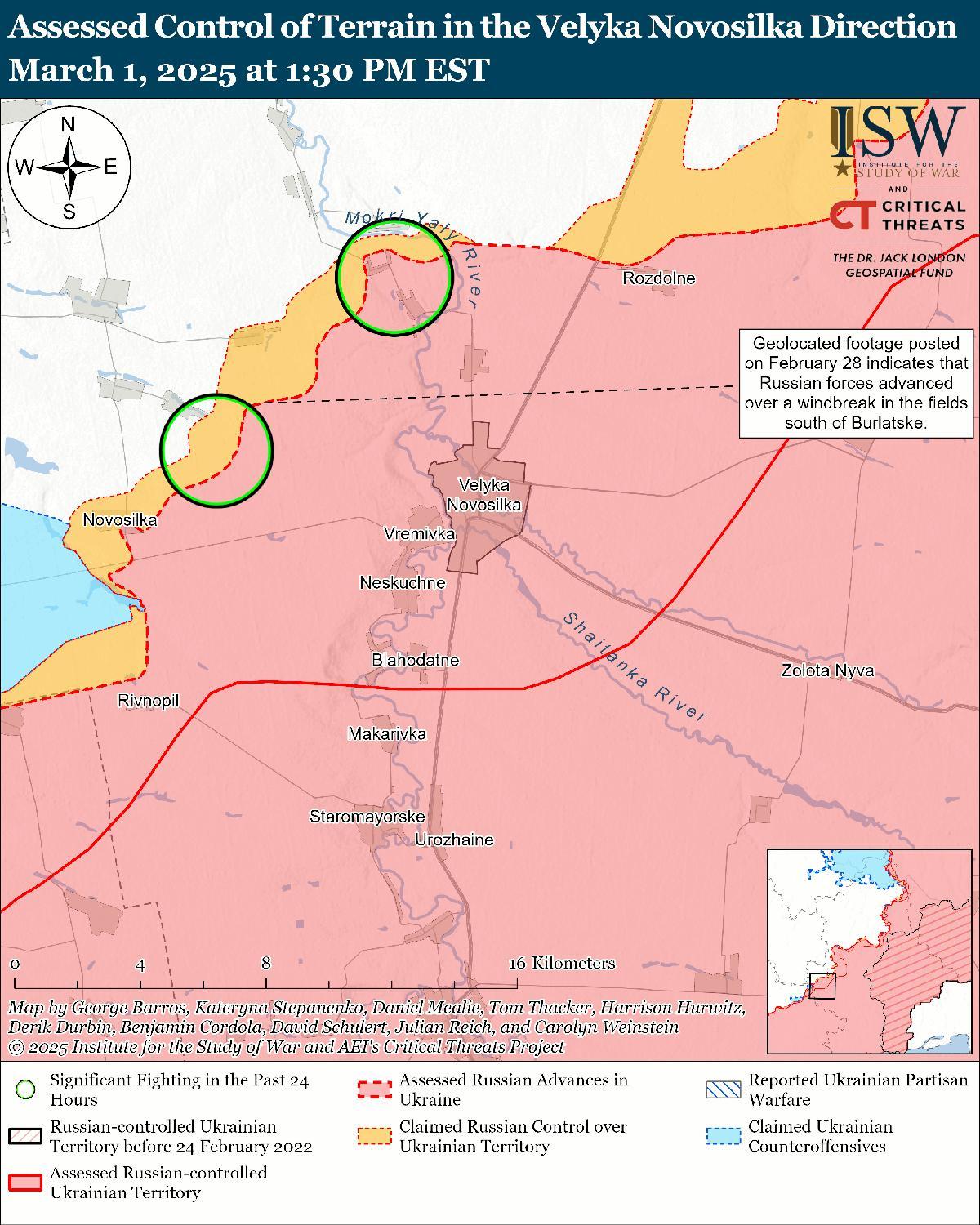 Оценка российского продвижения: Геолоцированные кадры, опубликованные 28 февраля, показывают, что российские войска продвинулись к югу от Бурлацкого. [50]